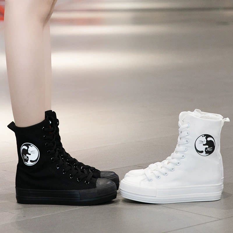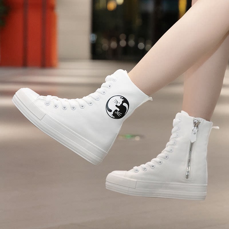 远步女鞋白色帆布鞋高帮女款休闲鞋子百搭厚底球鞋小白鞋增高板鞋