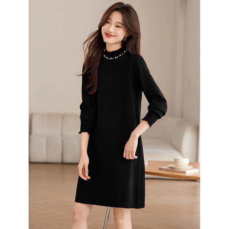 2025新款中长款羊毛针织打底衫红色连衣裙女秋冬配大衣的毛衣裙子