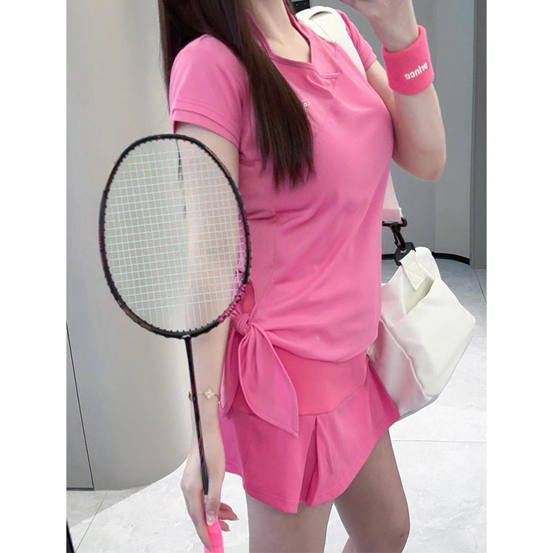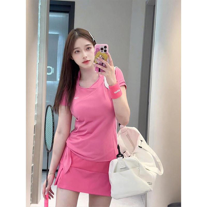 绝美粉色羽毛球服套装女2026新款高颜值运动修身显瘦球服短袖裙子