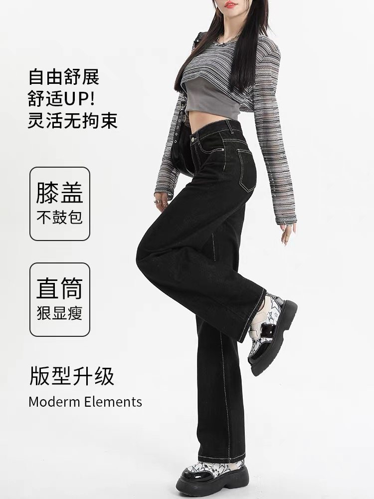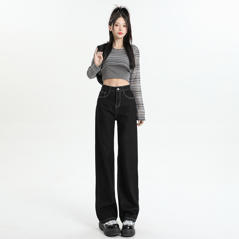 黑色阔腿牛仔裤女秋冬春季2026新款高腰宽松小个子窄版拖地直筒裤