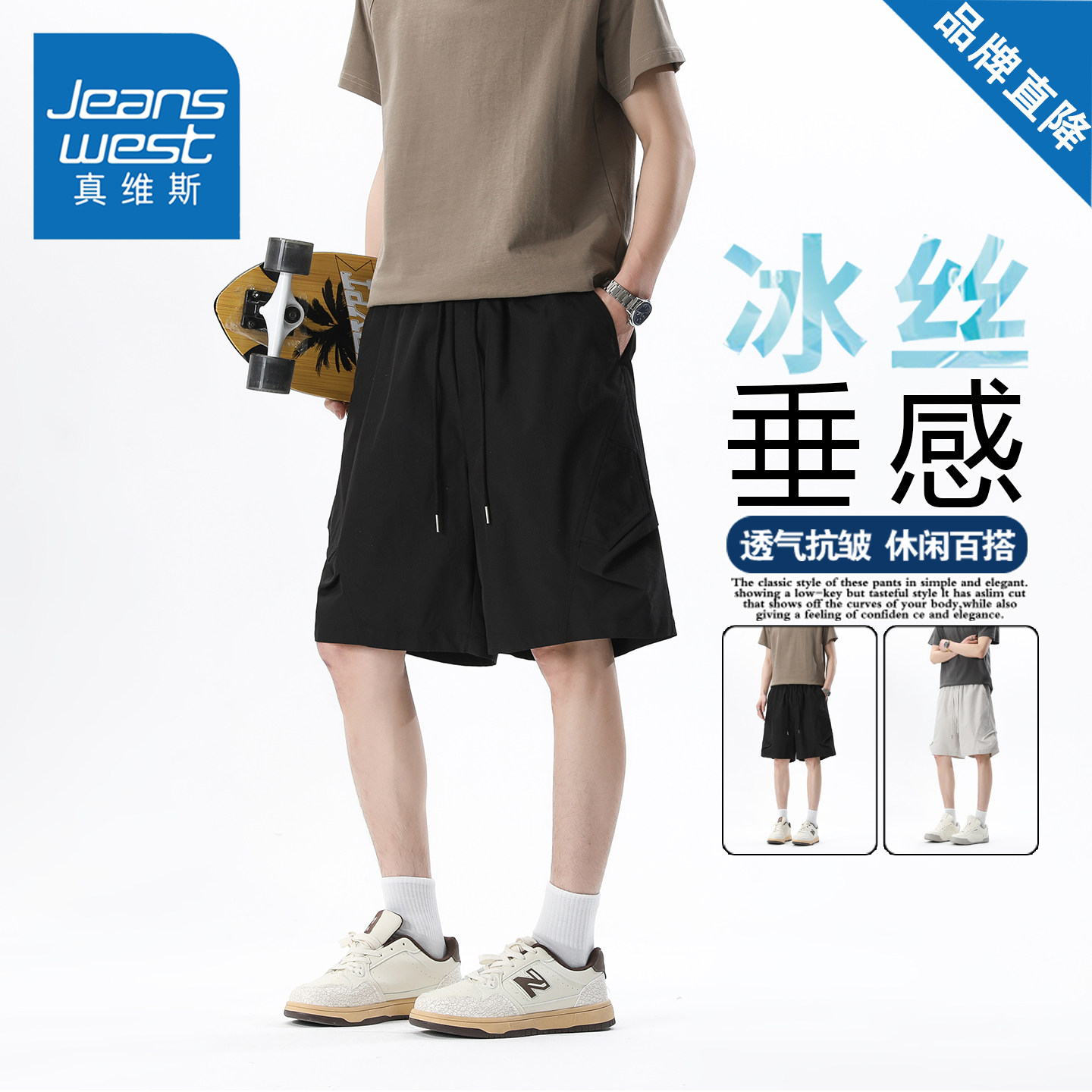 真维斯冰丝速干美式工装短裤男女款夏季宽松百搭直筒休闲五分裤子