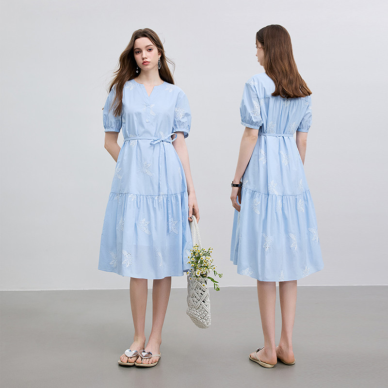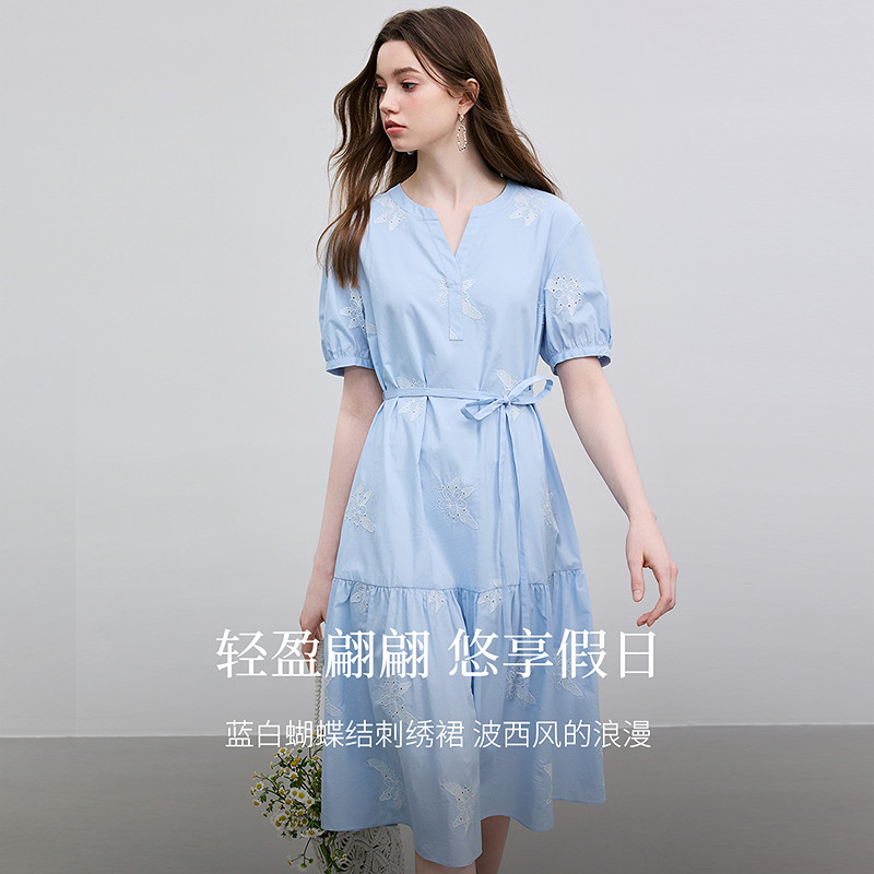 KBNE蓝色连衣裙法式小个子2026夏季新款绣花丁达尔裙通勤气质长裙