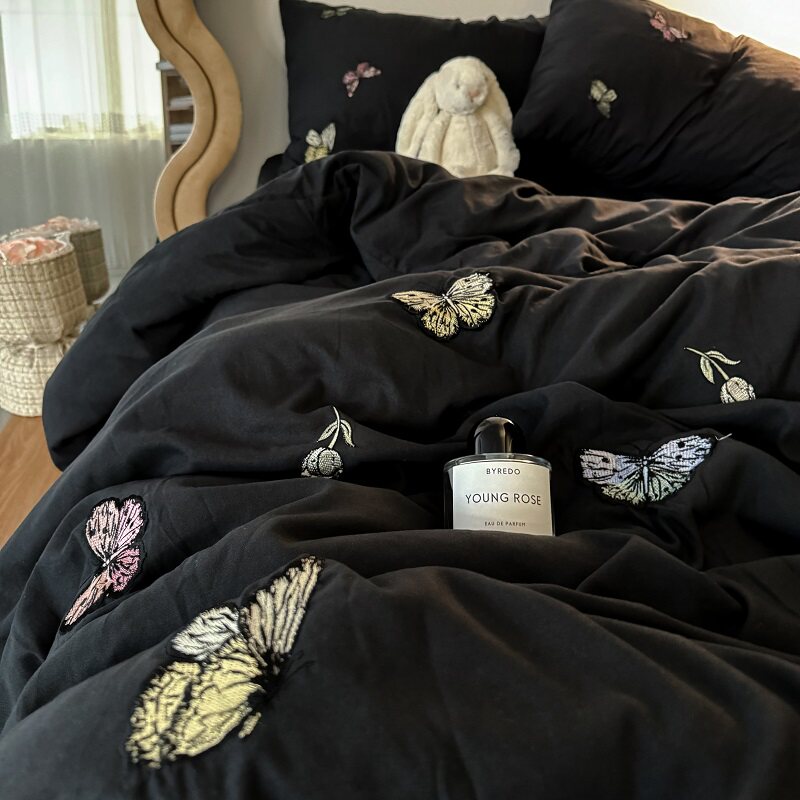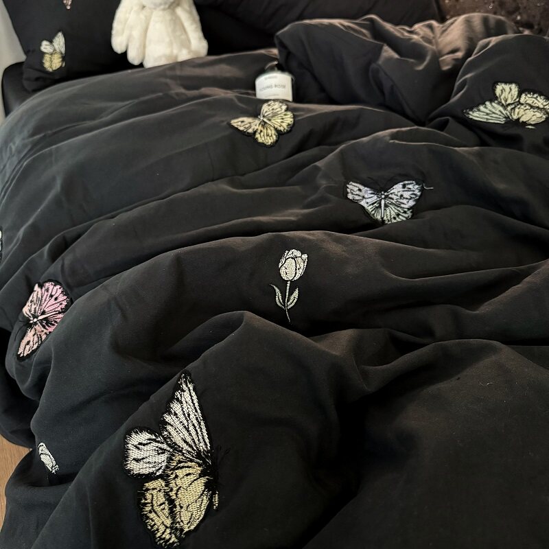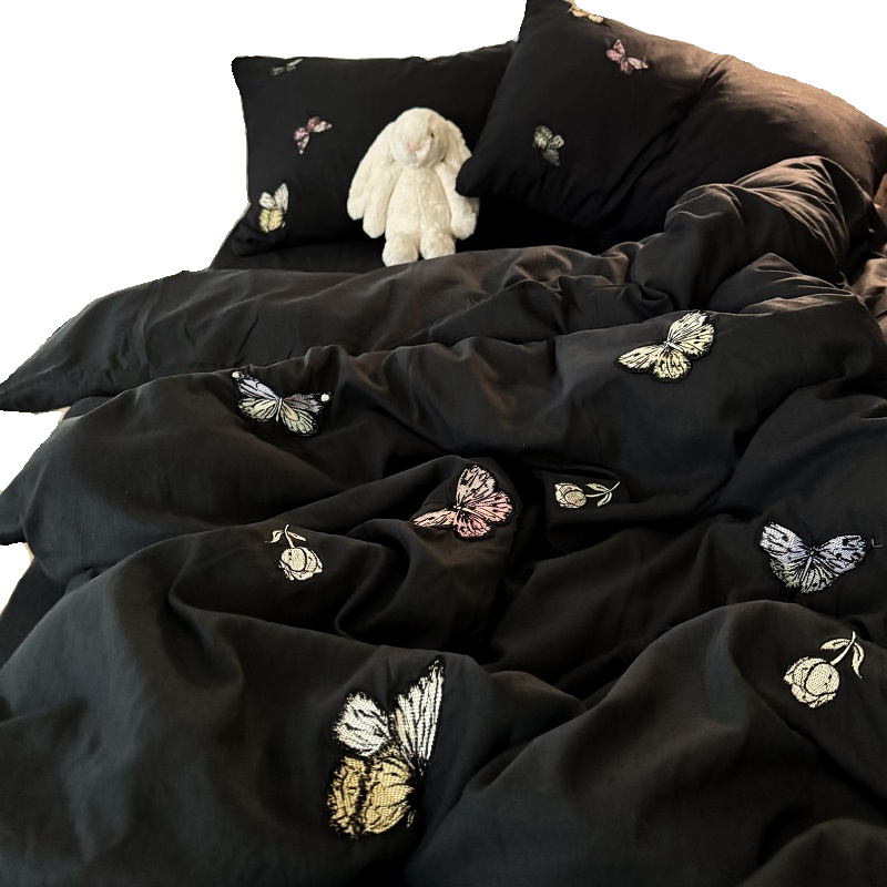 高级感少女蝴蝶刺绣床上被套四件套轻奢简约纯黑色床单三件套春夏