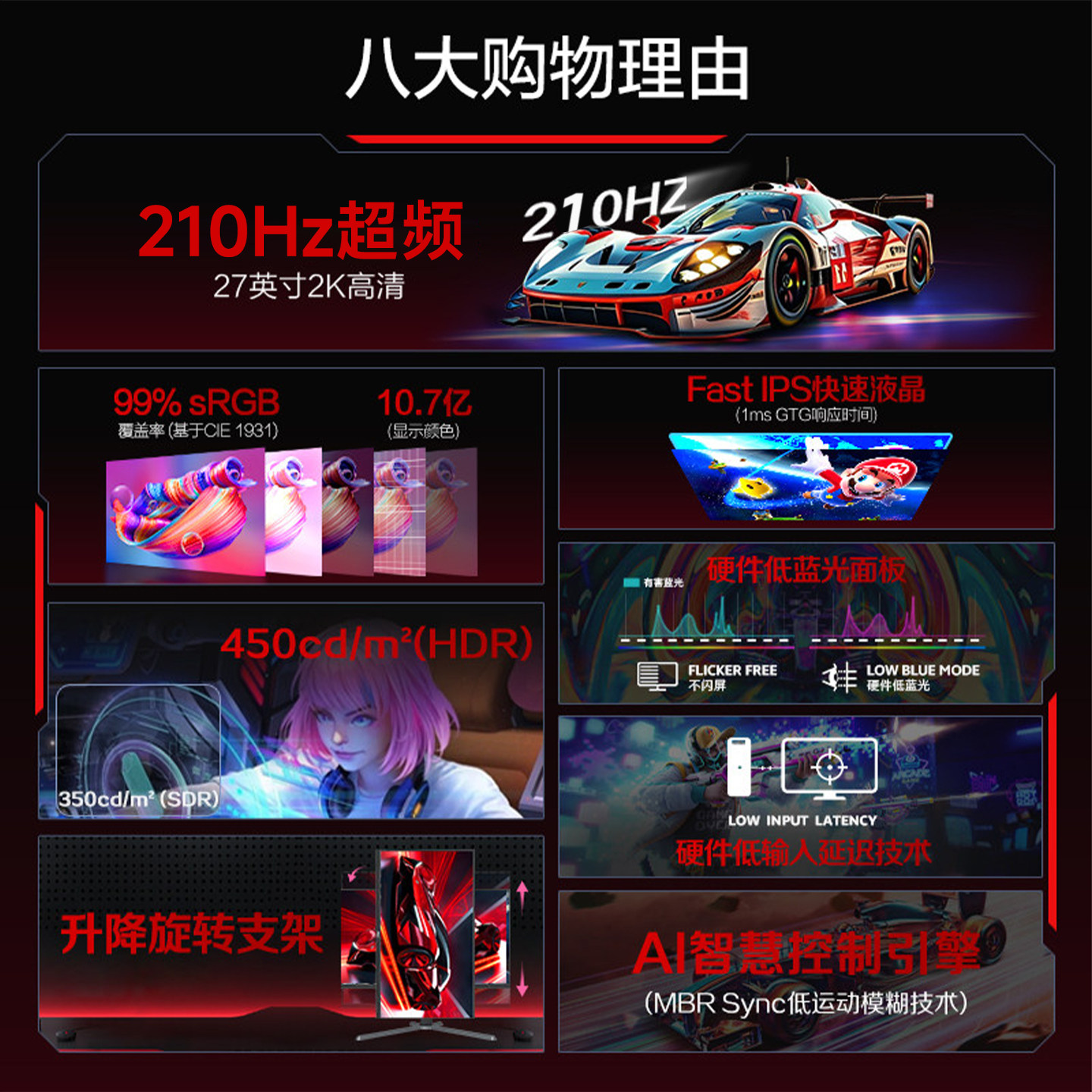 311线报网描述:FastIPS|210Hz|10Bit|硬件低蓝光|HDR400