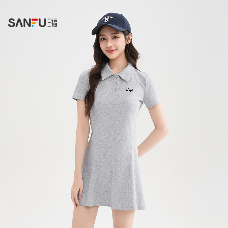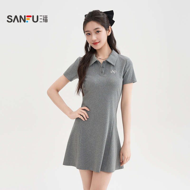三福连衣裙女2026新款夏季简约刺绣Polo领收腰修身黑色短裙子女装