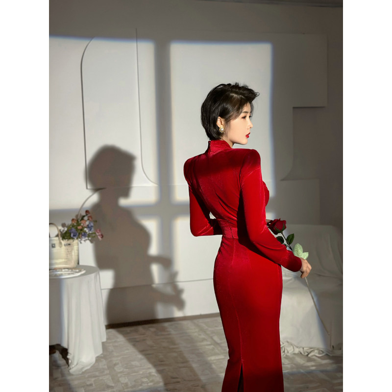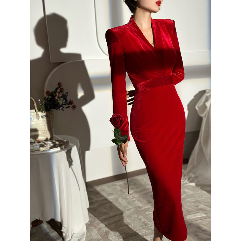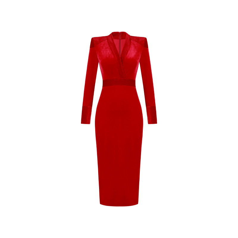 XULU原创新款进口红色丝绒拼接性感包臀裙修身高腰长袖V领连衣裙