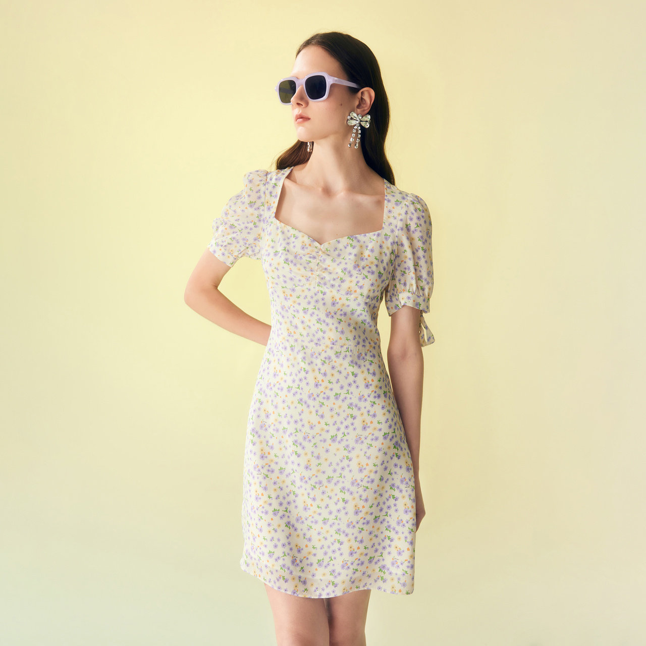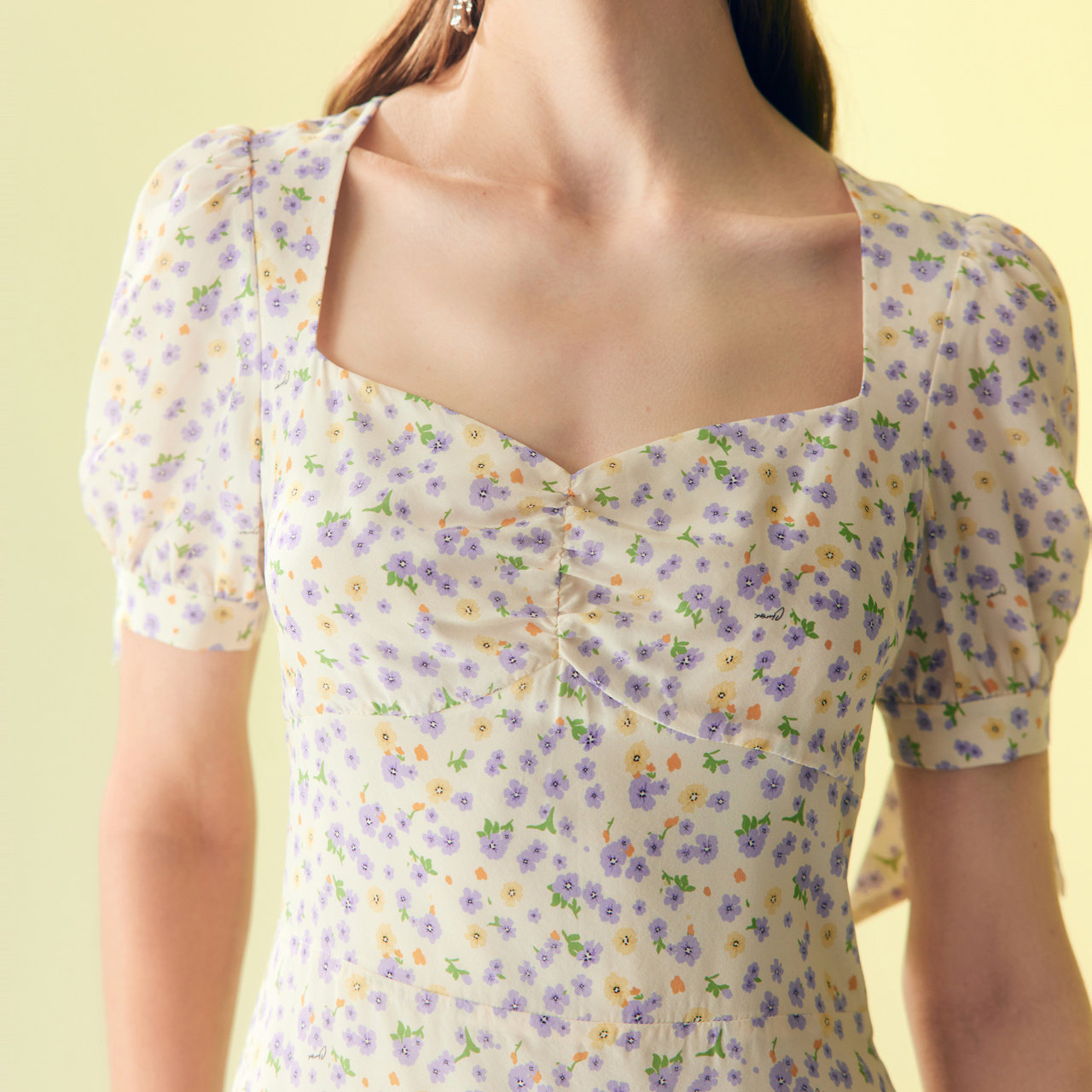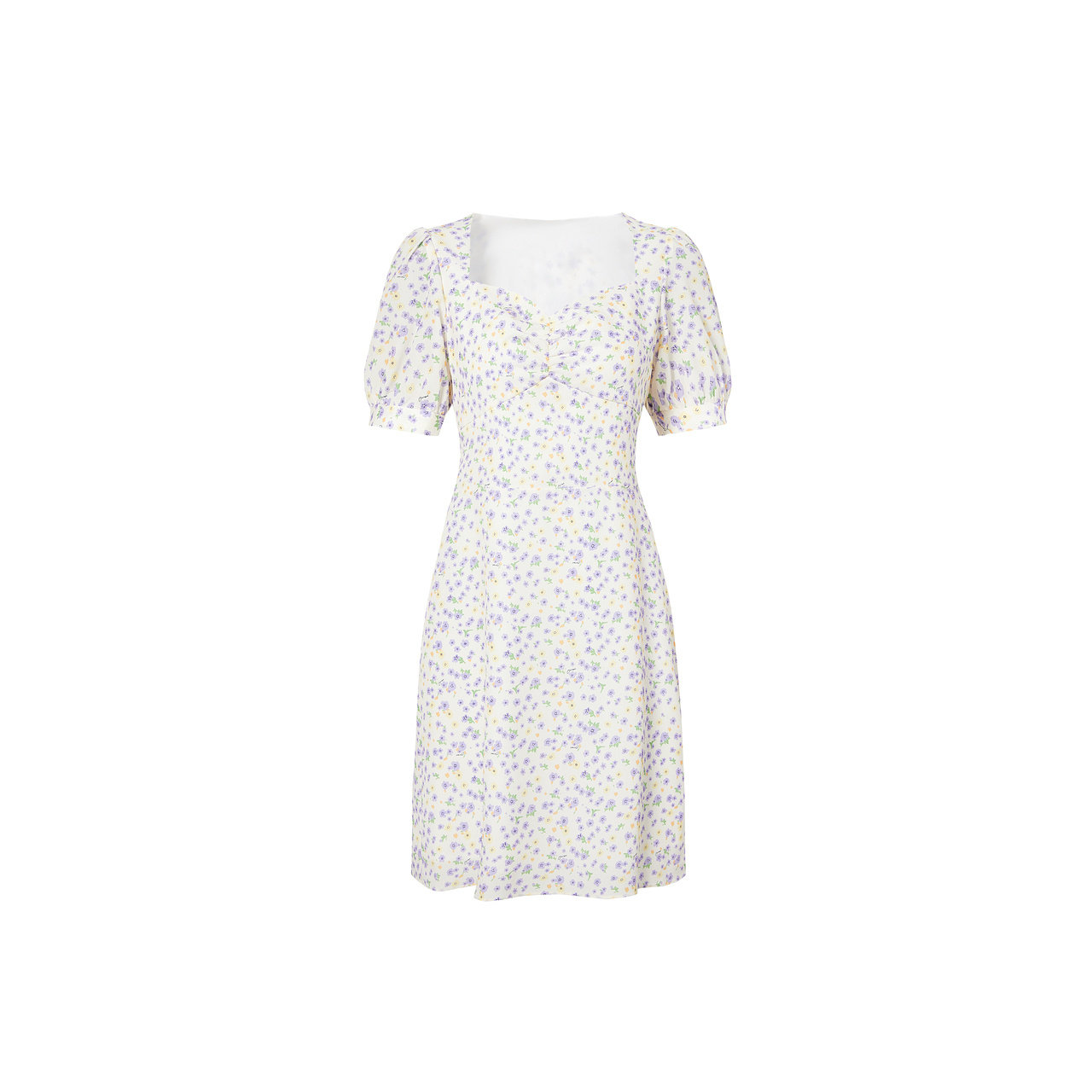 摩萨克夏季法式紫黄碎花印花方领泡泡袖修身收腰短款连衣裙女