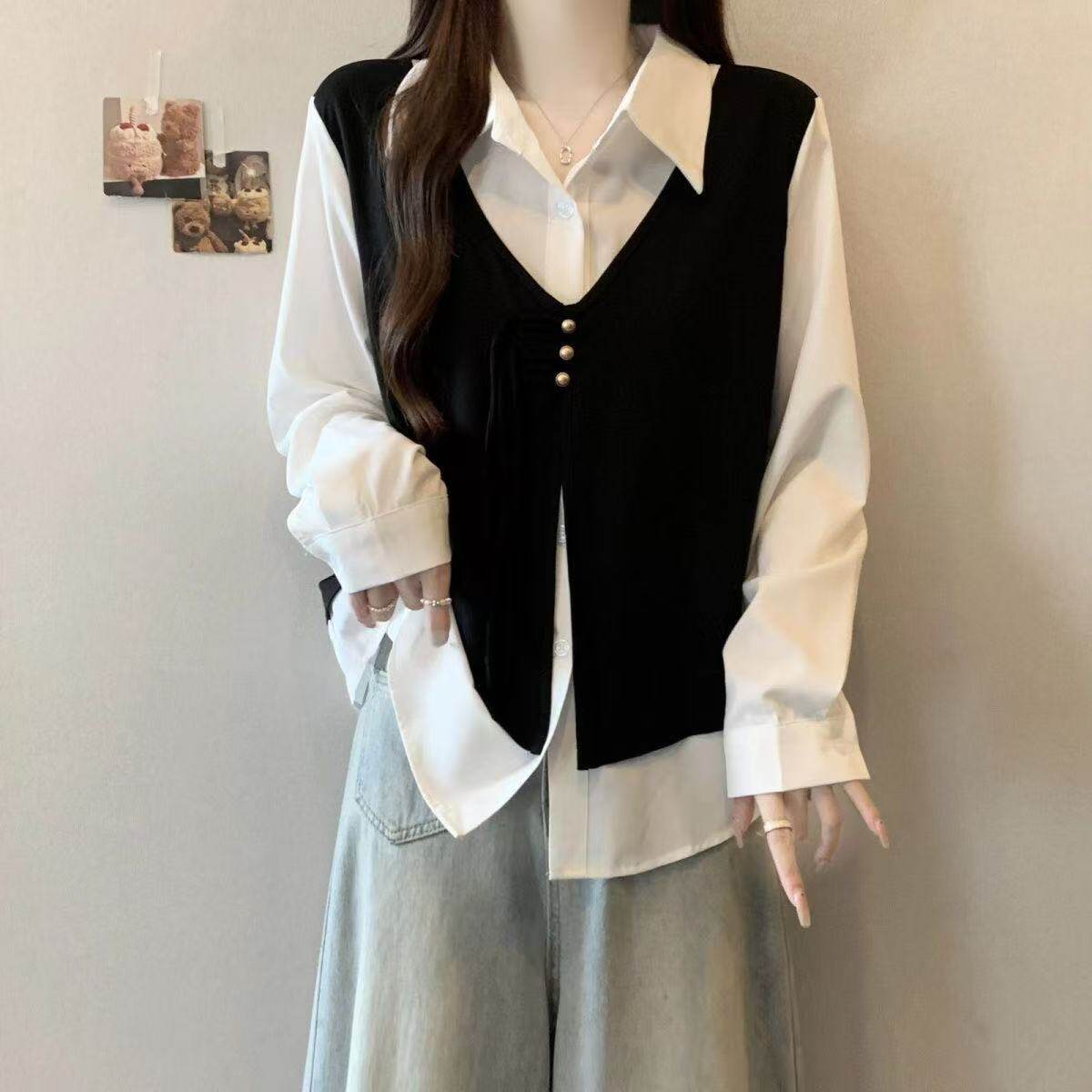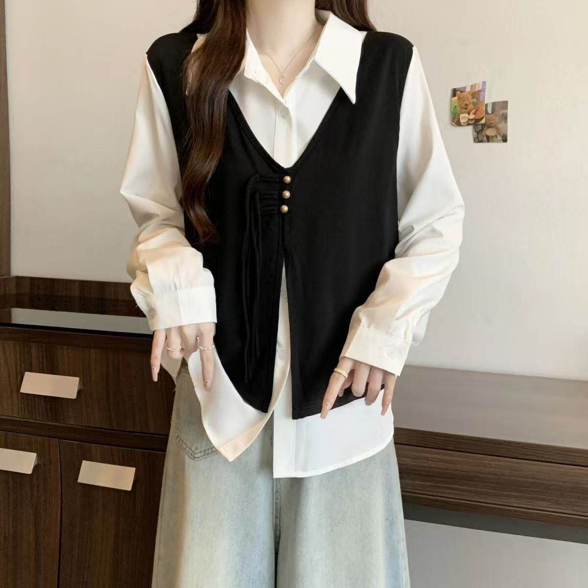 大码遮肚子假两件2026春季新款小香风马甲衬衫女胖mm显瘦长袖上衣