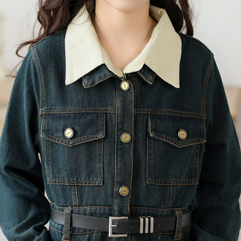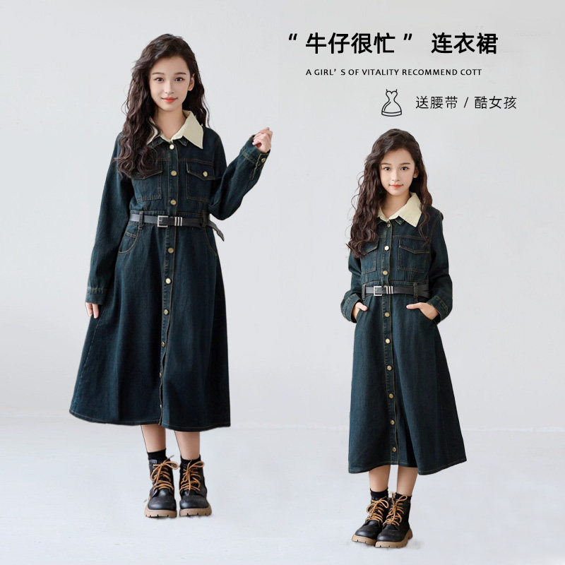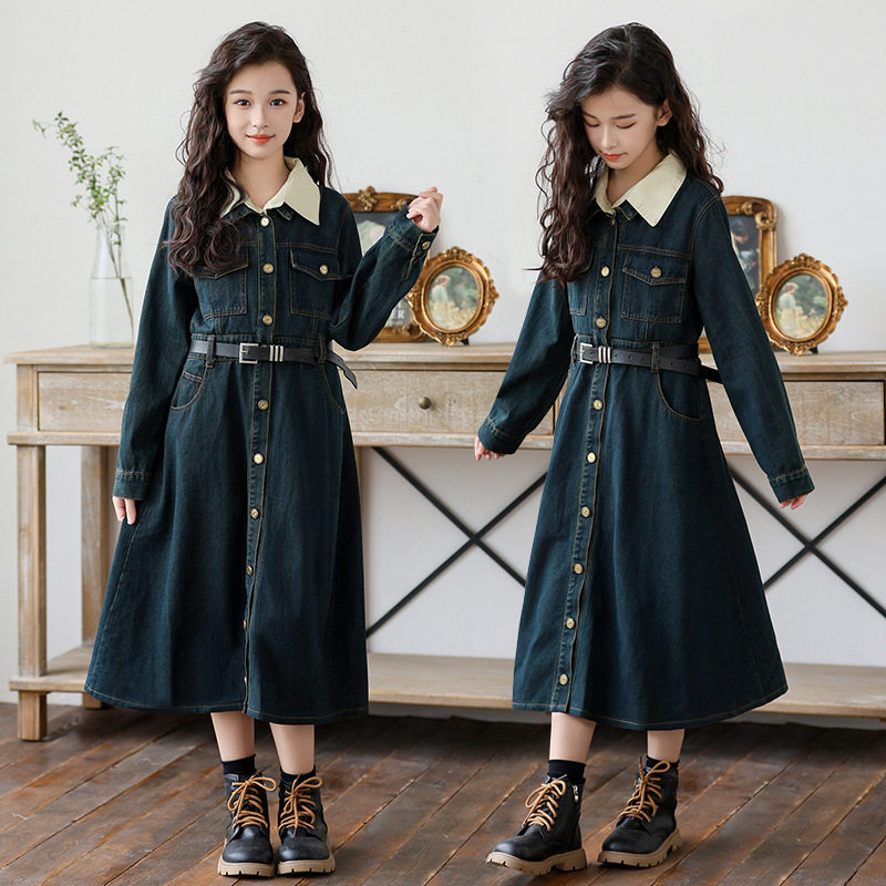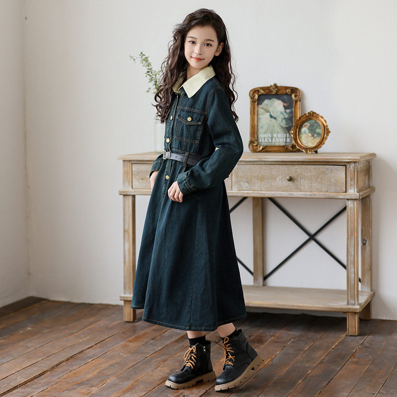 女童春秋连衣裙长袖复古收腰长裙中大童洋气裙子初中学生牛仔衬裙