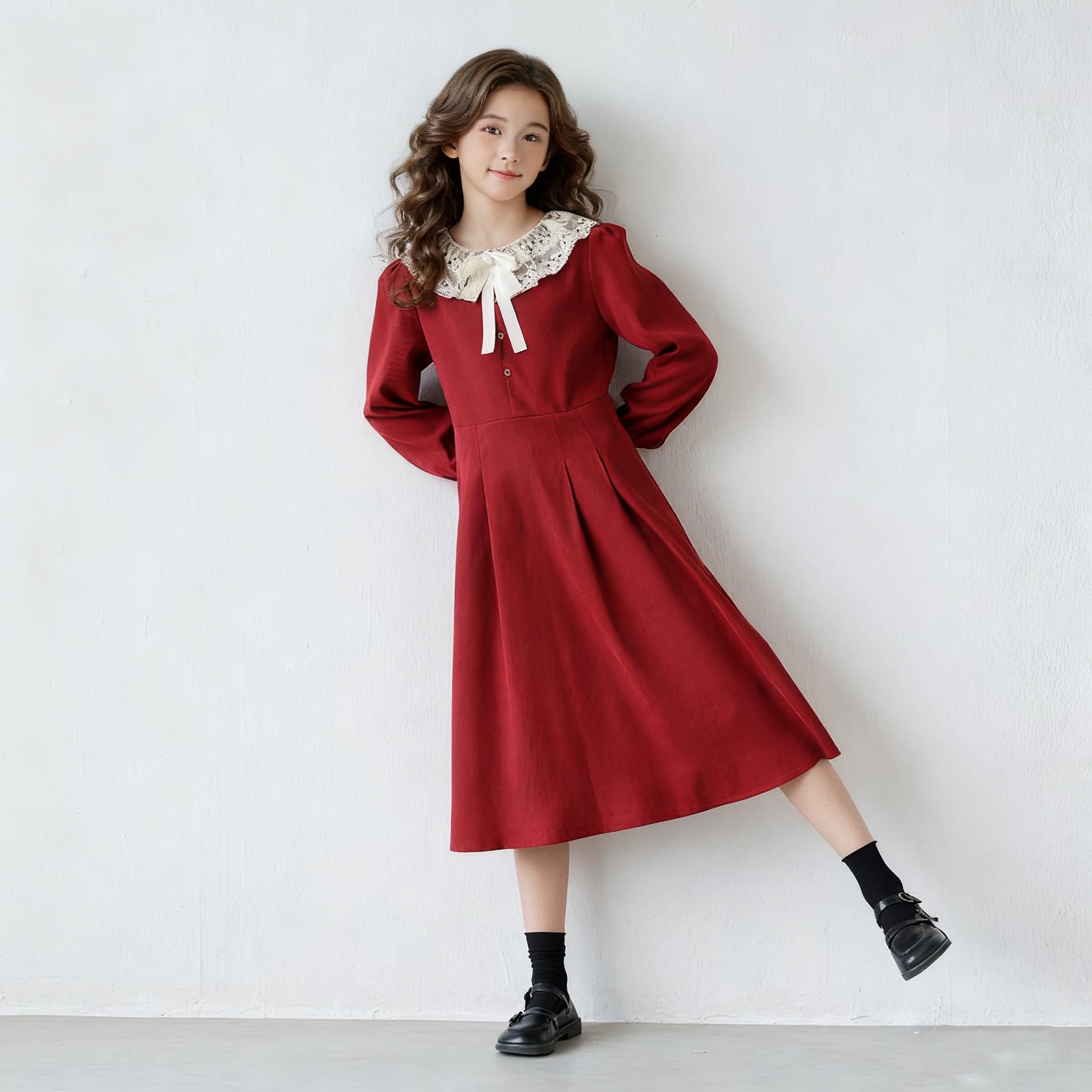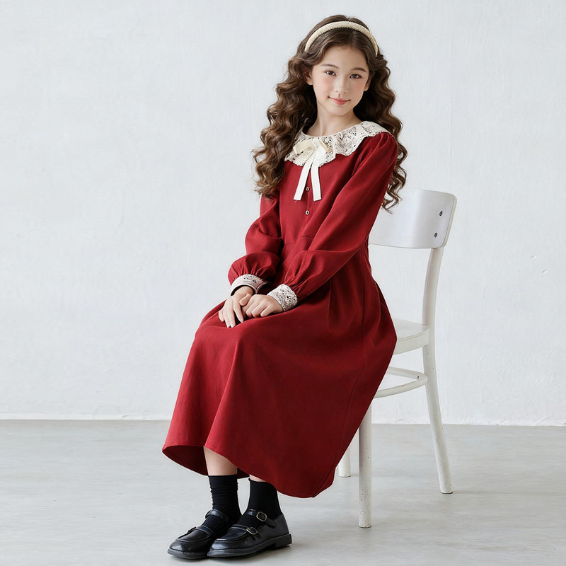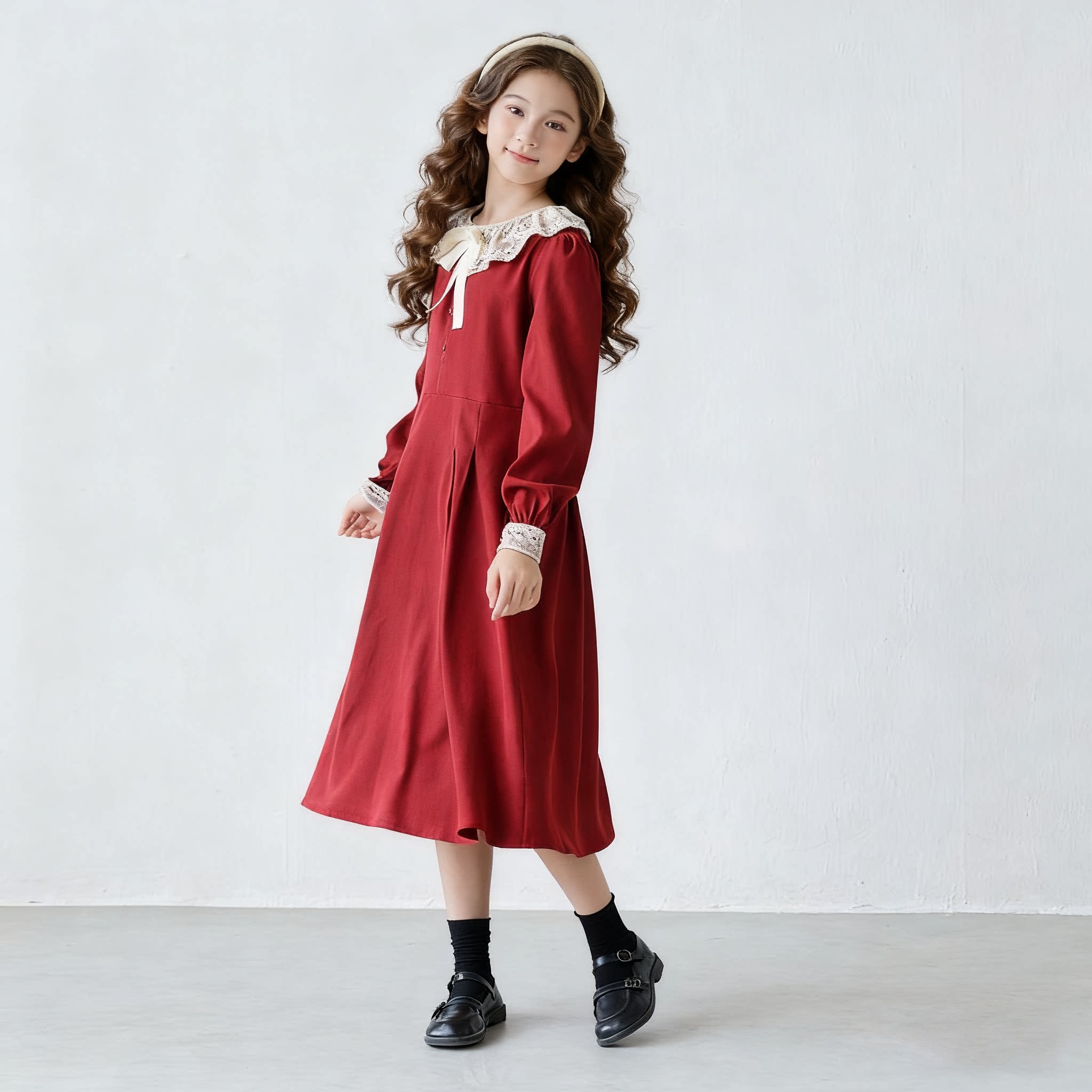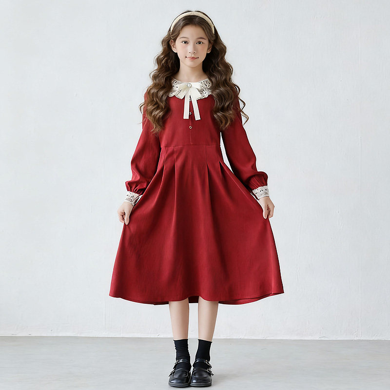 法式红色秋季女童长袖连衣裙甜美女式公主裙中大童初中生裙子文艺