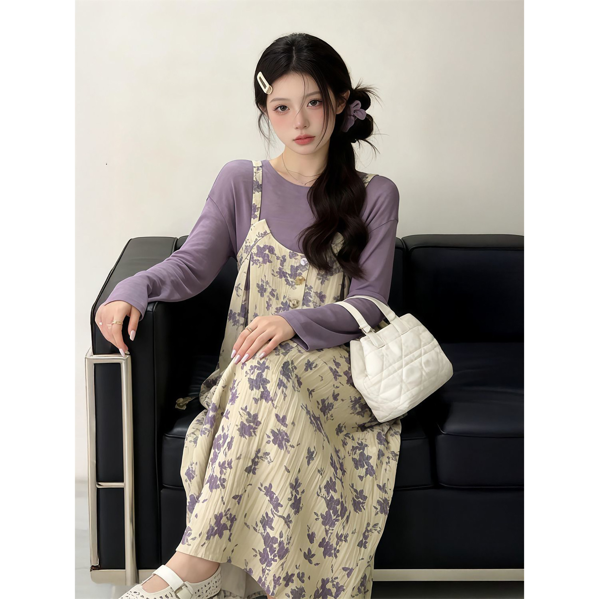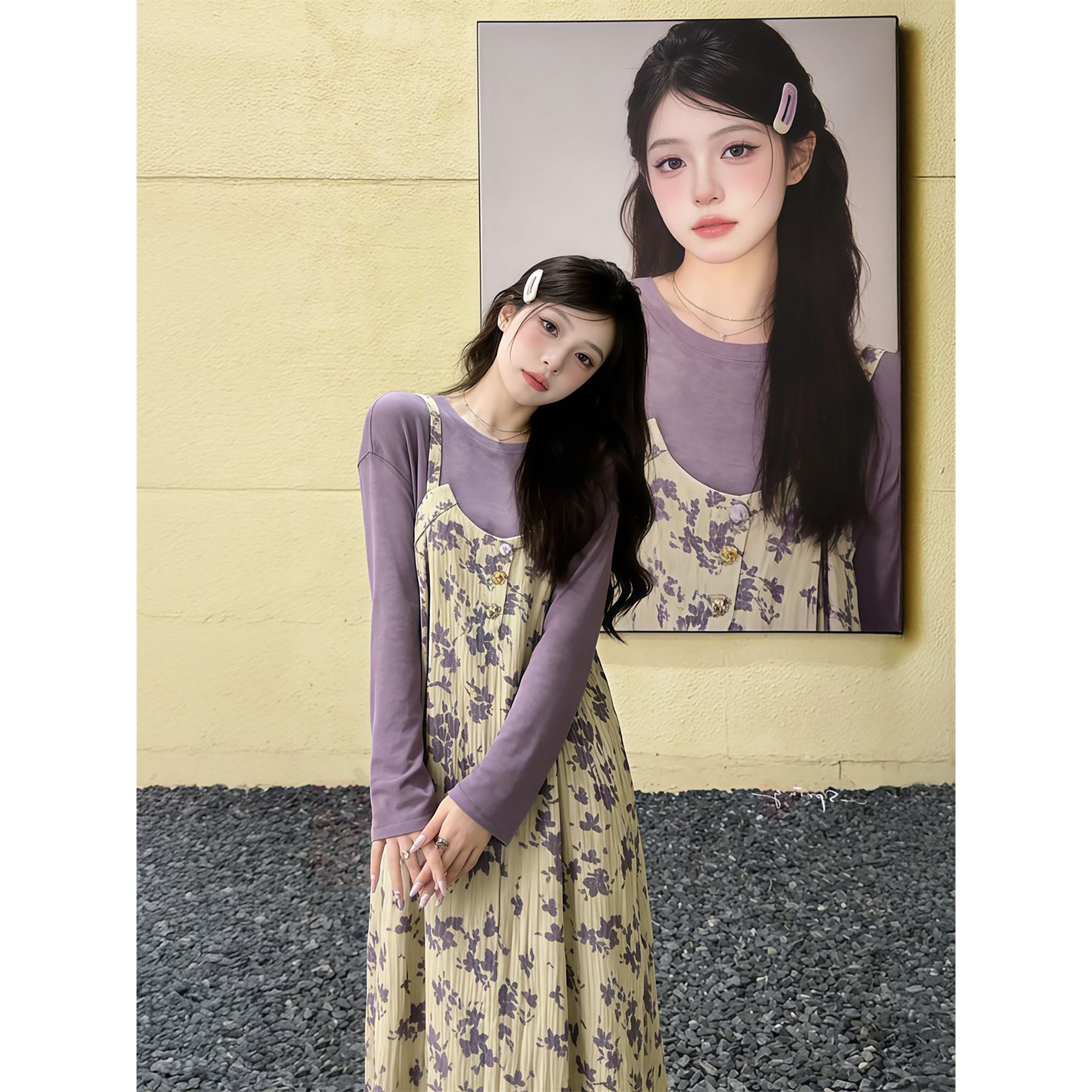 2026春季新款法式气质碎花吊带连衣裙+紫色长袖上衣女学生两件套