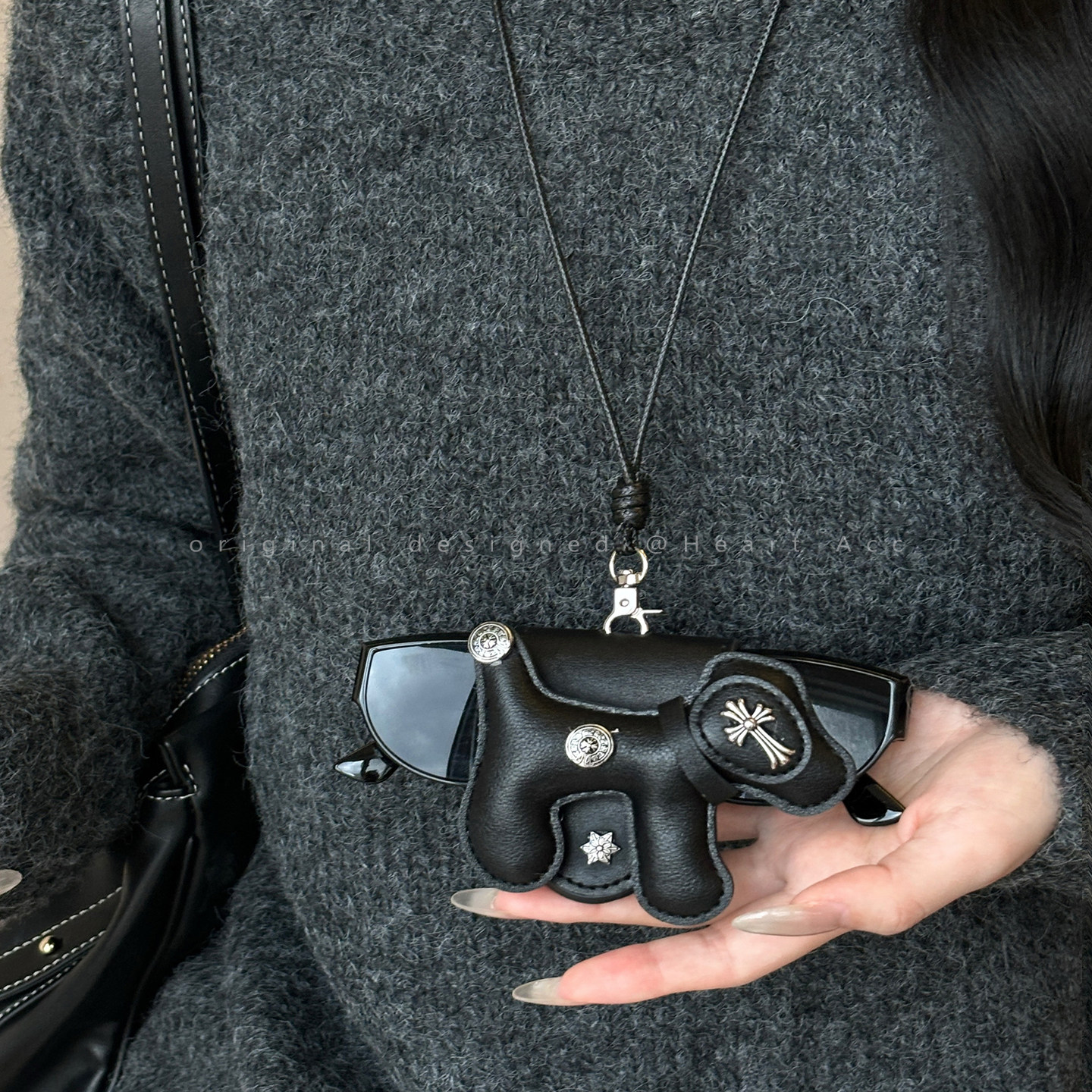黑色小狗十字架皮革磁吸眼镜夹项链女墨镜收纳长款挂脖配饰卫衣链