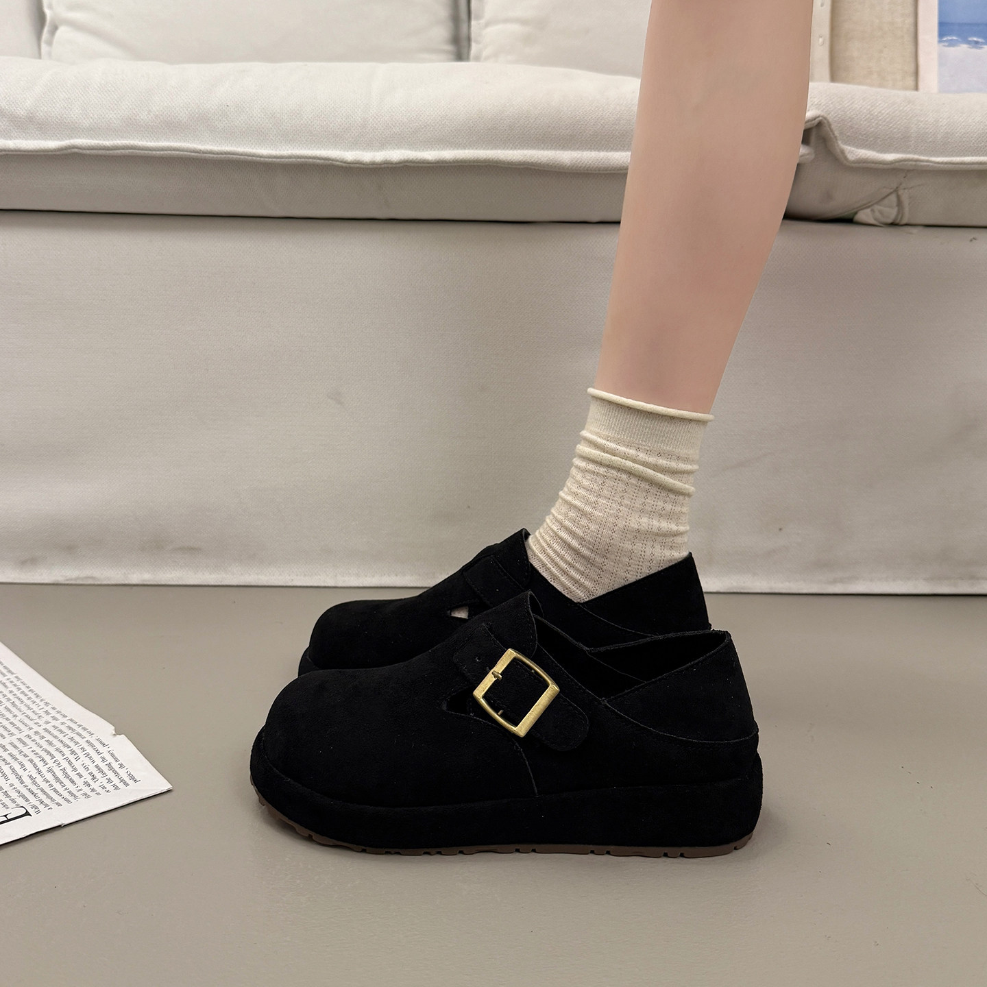 法式厚底增高单鞋女一脚蹬黑色勃肯鞋2026新款配裙子春季玛丽珍鞋