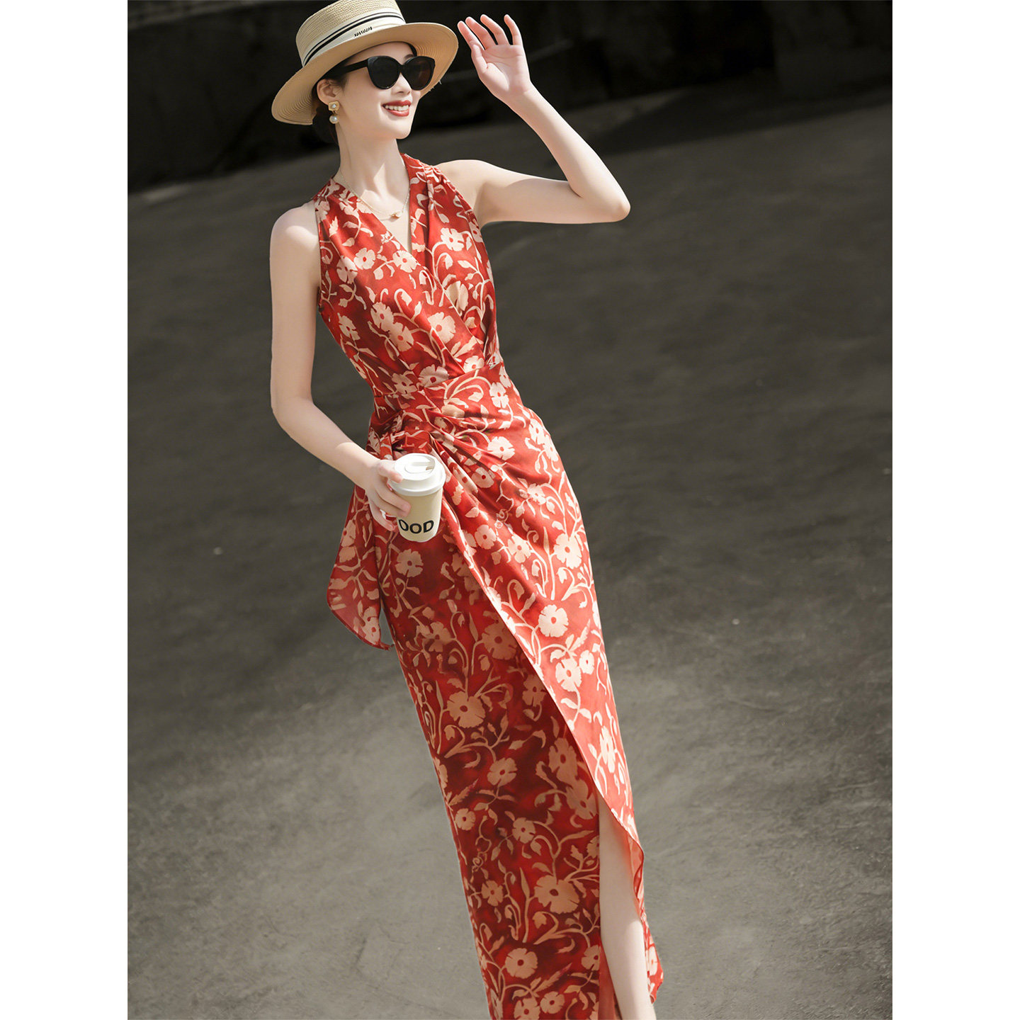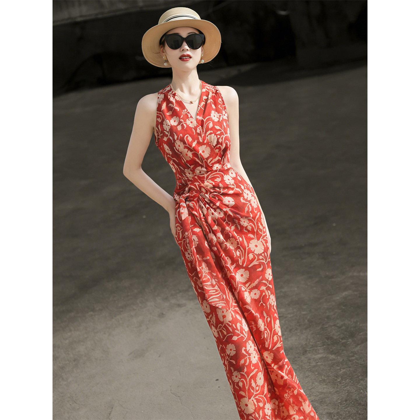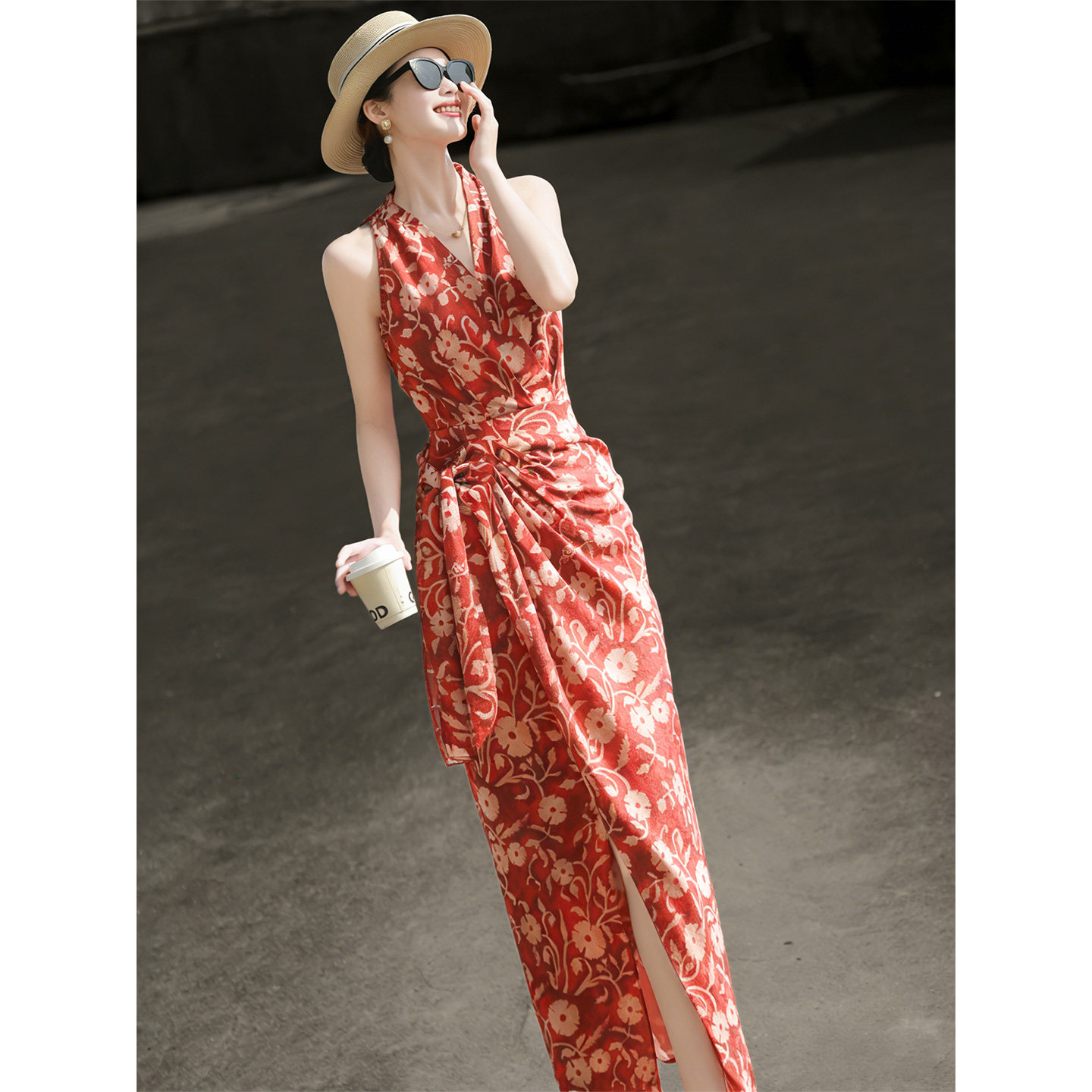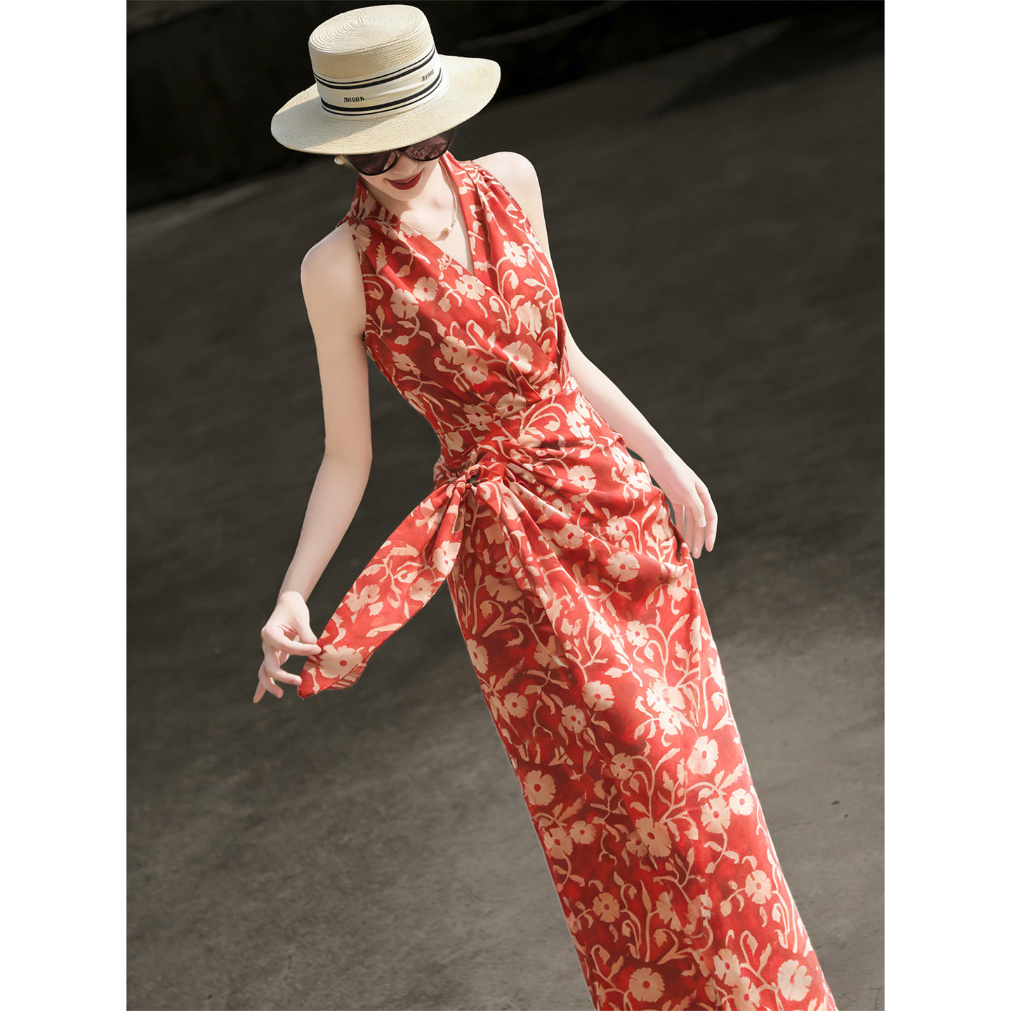 兰瑟儿2026春夏新款气质度假风法式收腰绑带挂脖背心印花连衣裙女