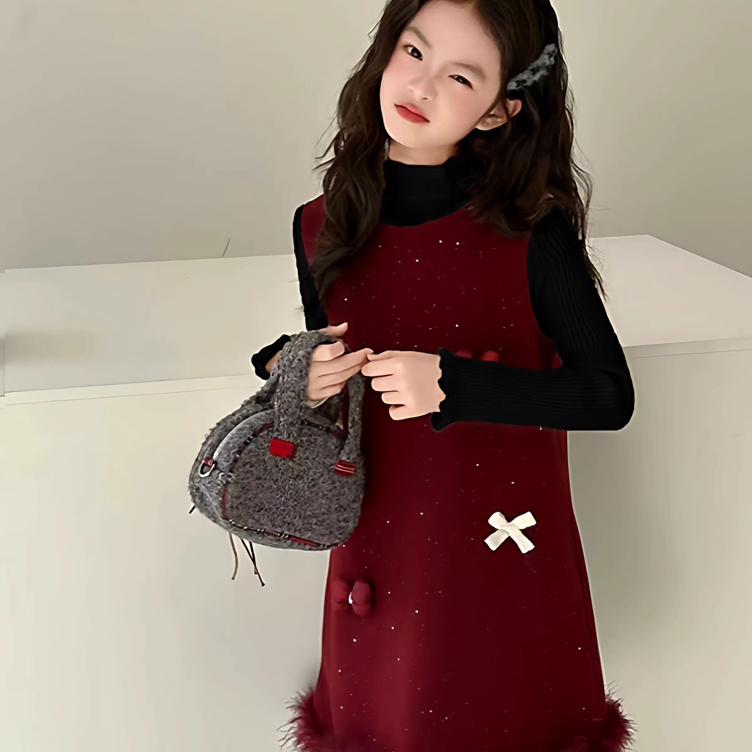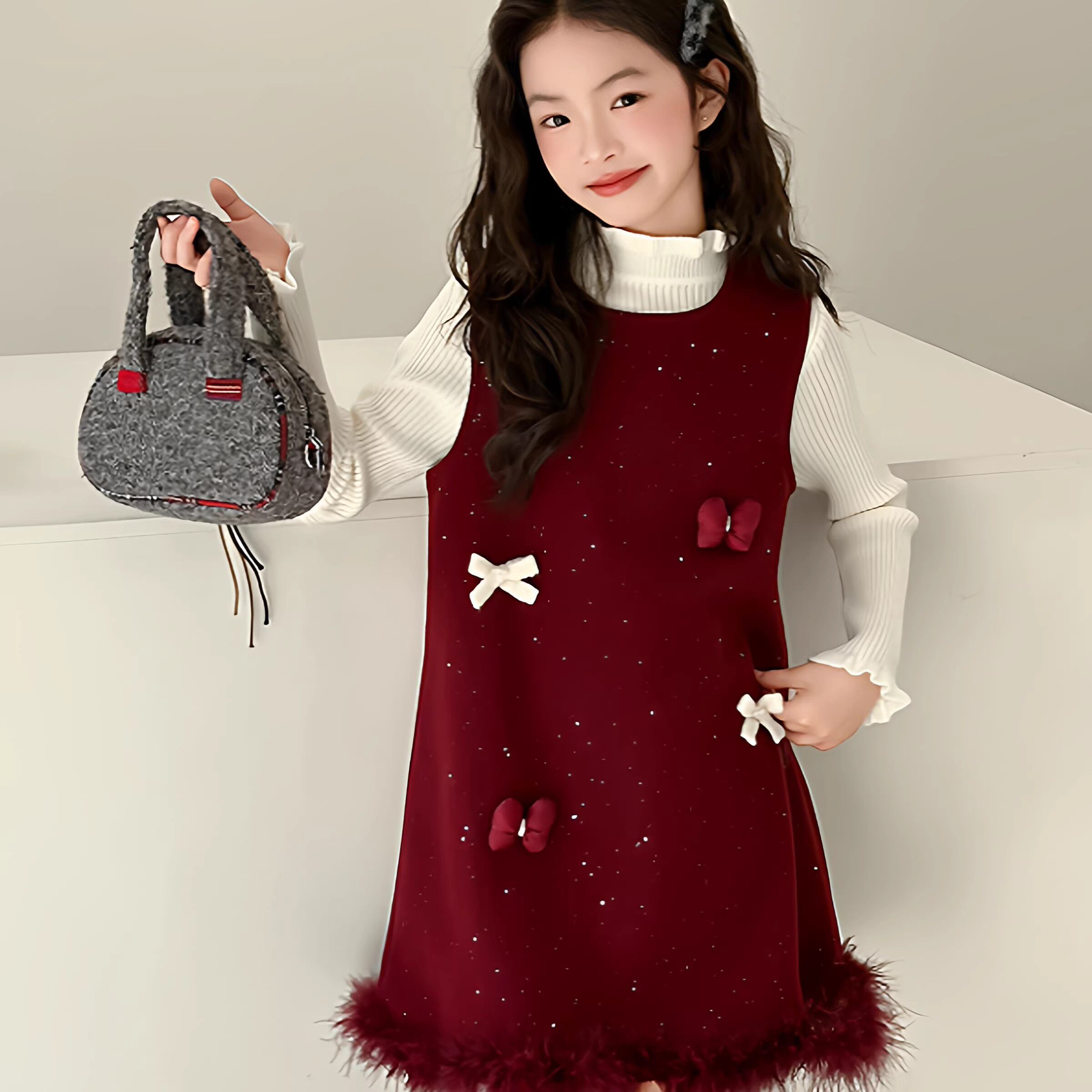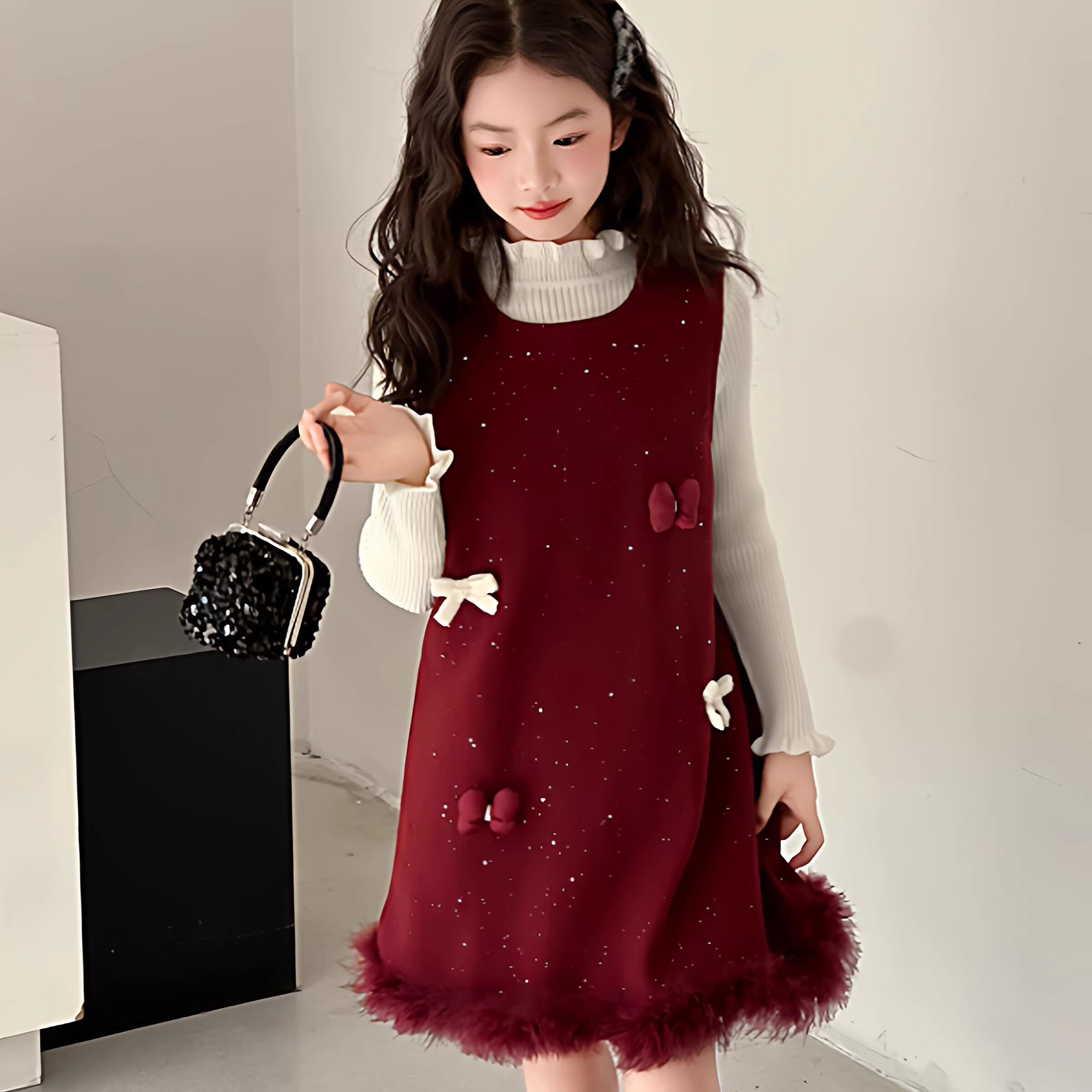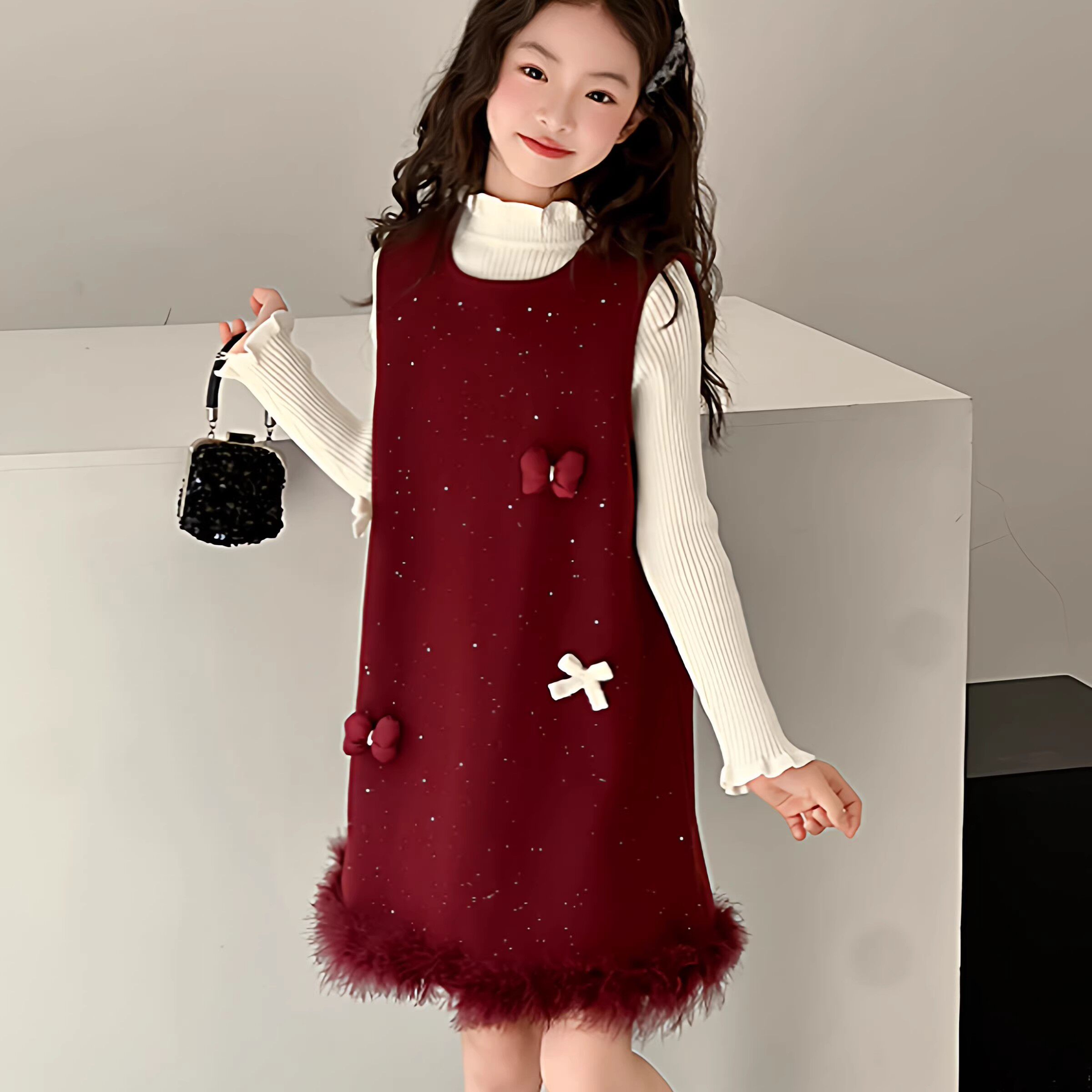 女童毛呢裙子秋冬2025新款儿童生日礼服加厚连衣裙女孩新年背心裙
