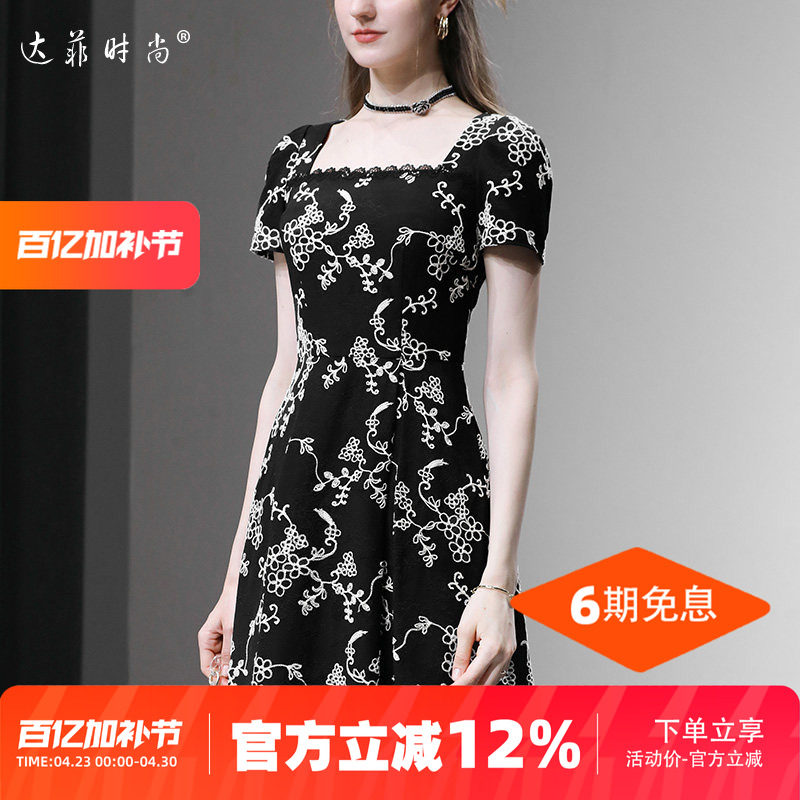 2026年夏季新款时尚法式方领撞色绣花泡泡袖收腰大摆连衣裙女