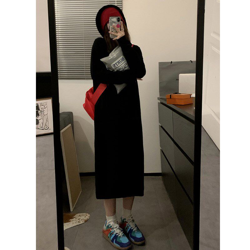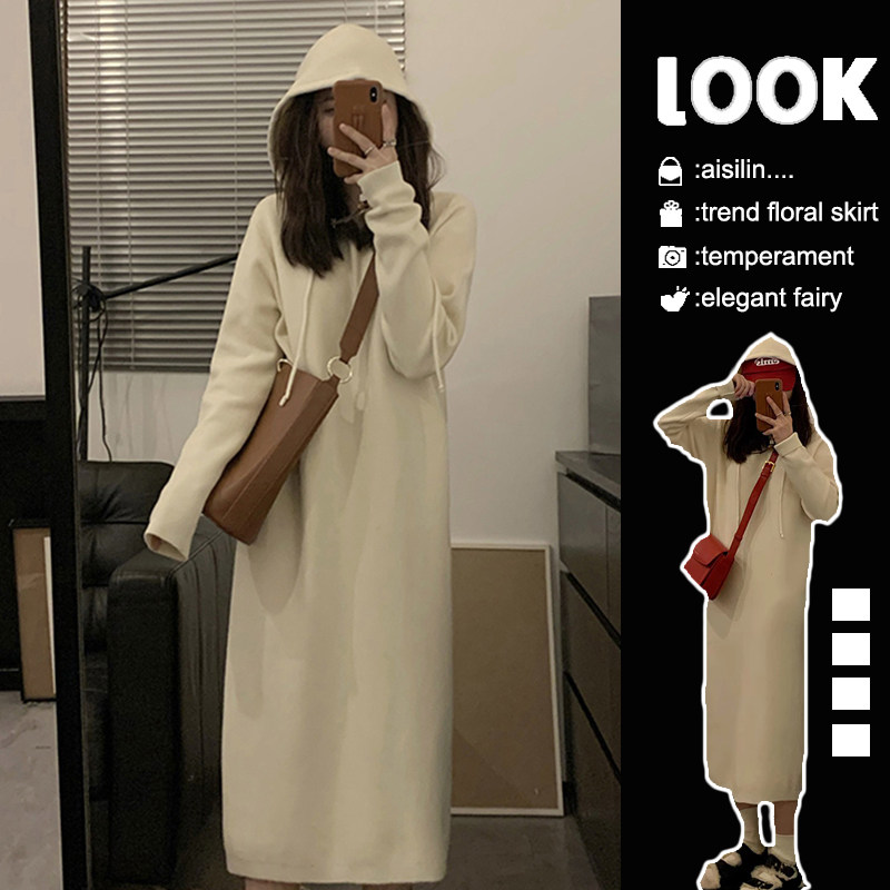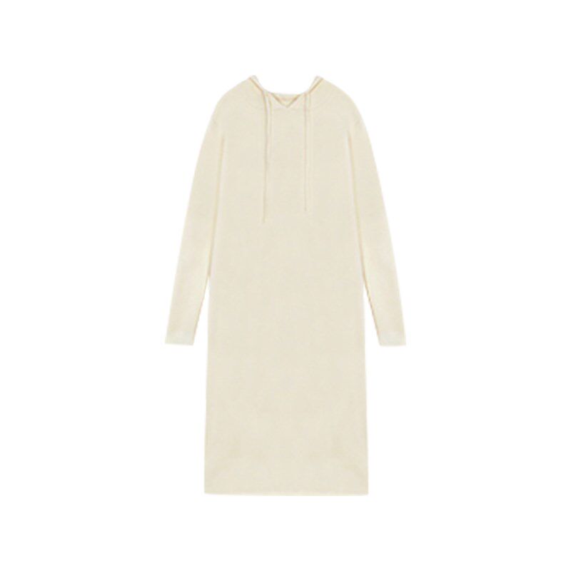 2024新款秋季连帽针织白色连衣裙子女小个子长款打底内搭毛衣长裙