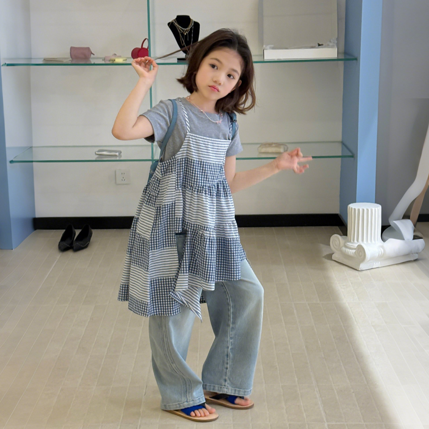 柒号童仓女大童韩版格子拼接吊带裙春装新款儿童洋气可叠穿连衣裙
