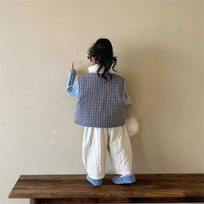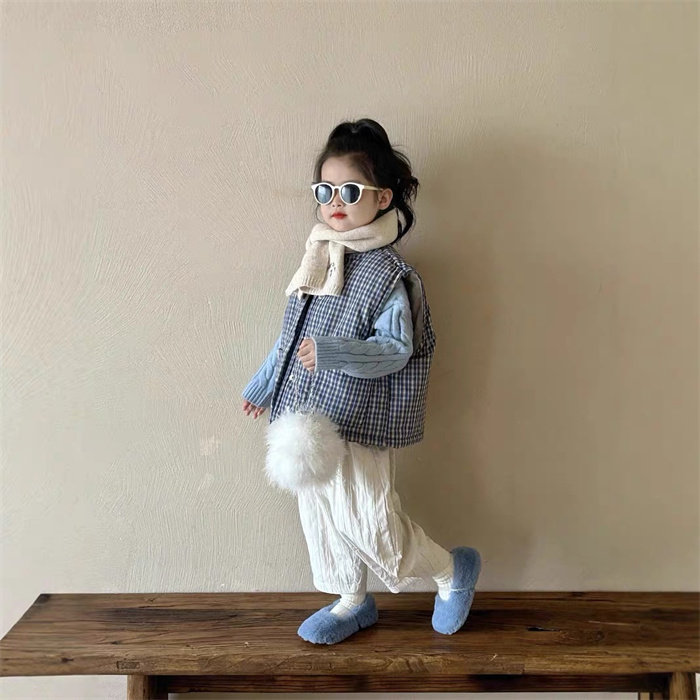 冬季女童韩系穿搭浅蓝色麻花毛衣+格子棉马甲+加绒韩版竖条哈伦裤