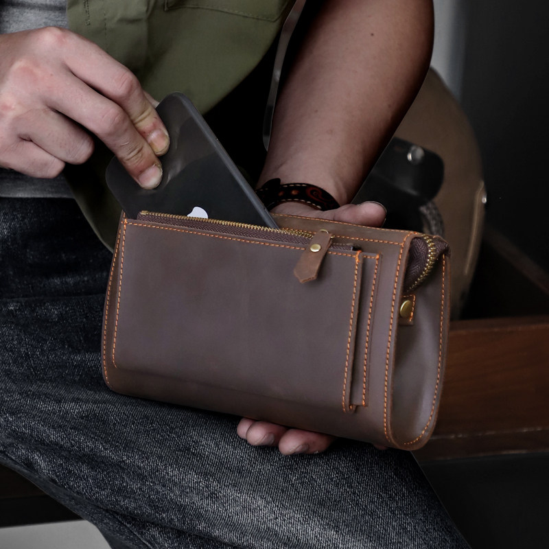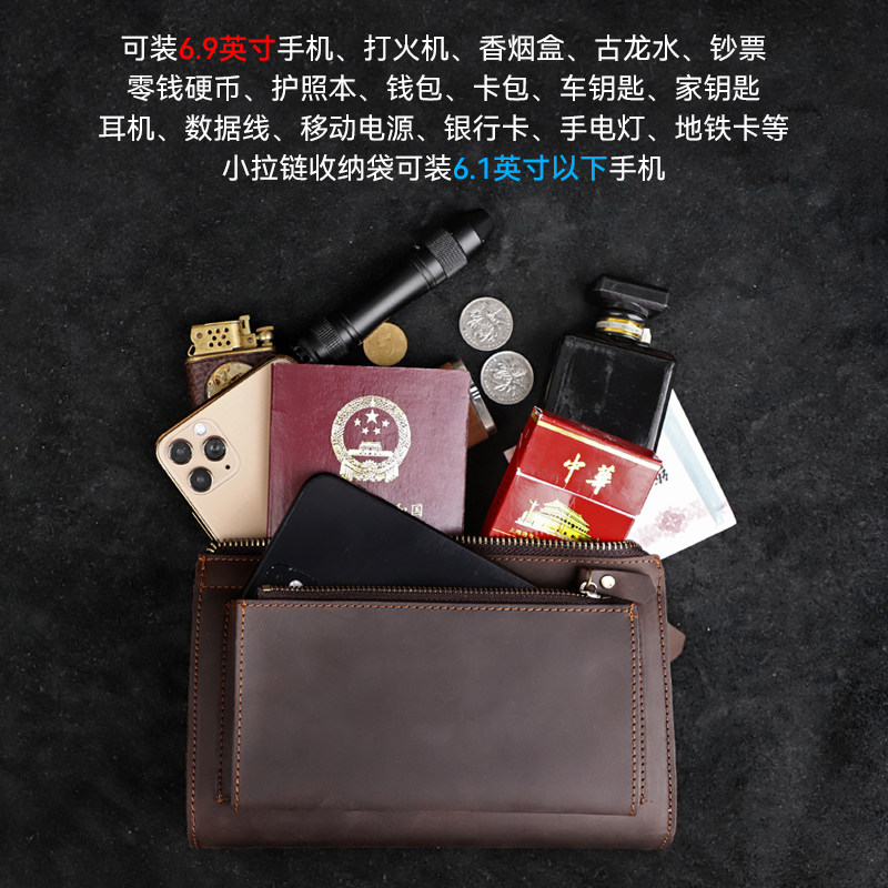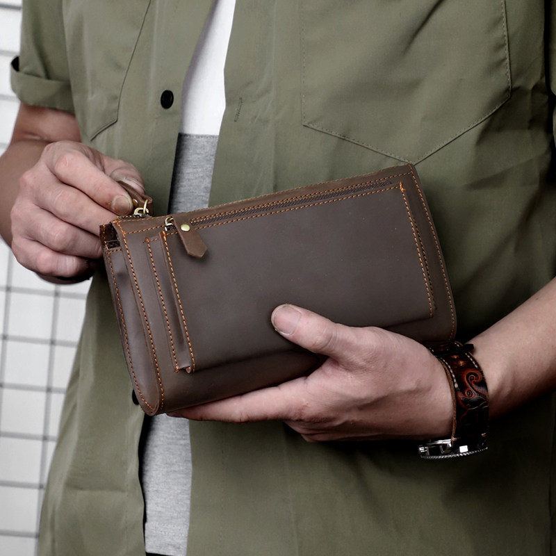 手包男真皮拉链长款钱包疯马皮复古大容量休闲男士头层牛皮手拿包