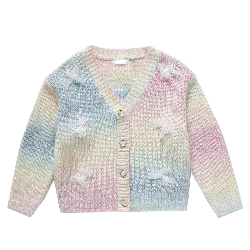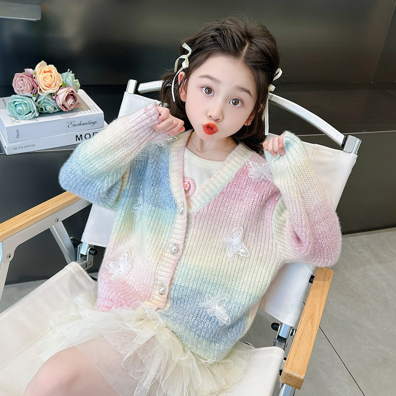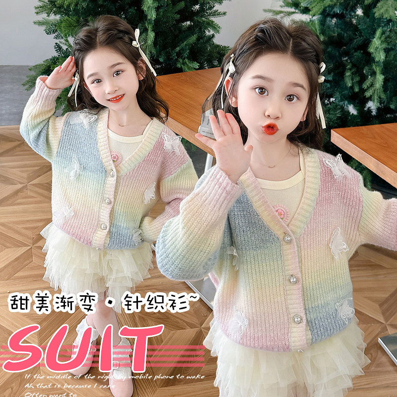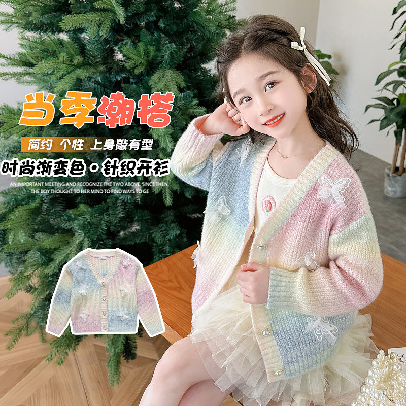 女童渐变毛衣外套秋装2025新款儿童洋气加厚女孩冬季时髦针织开衫