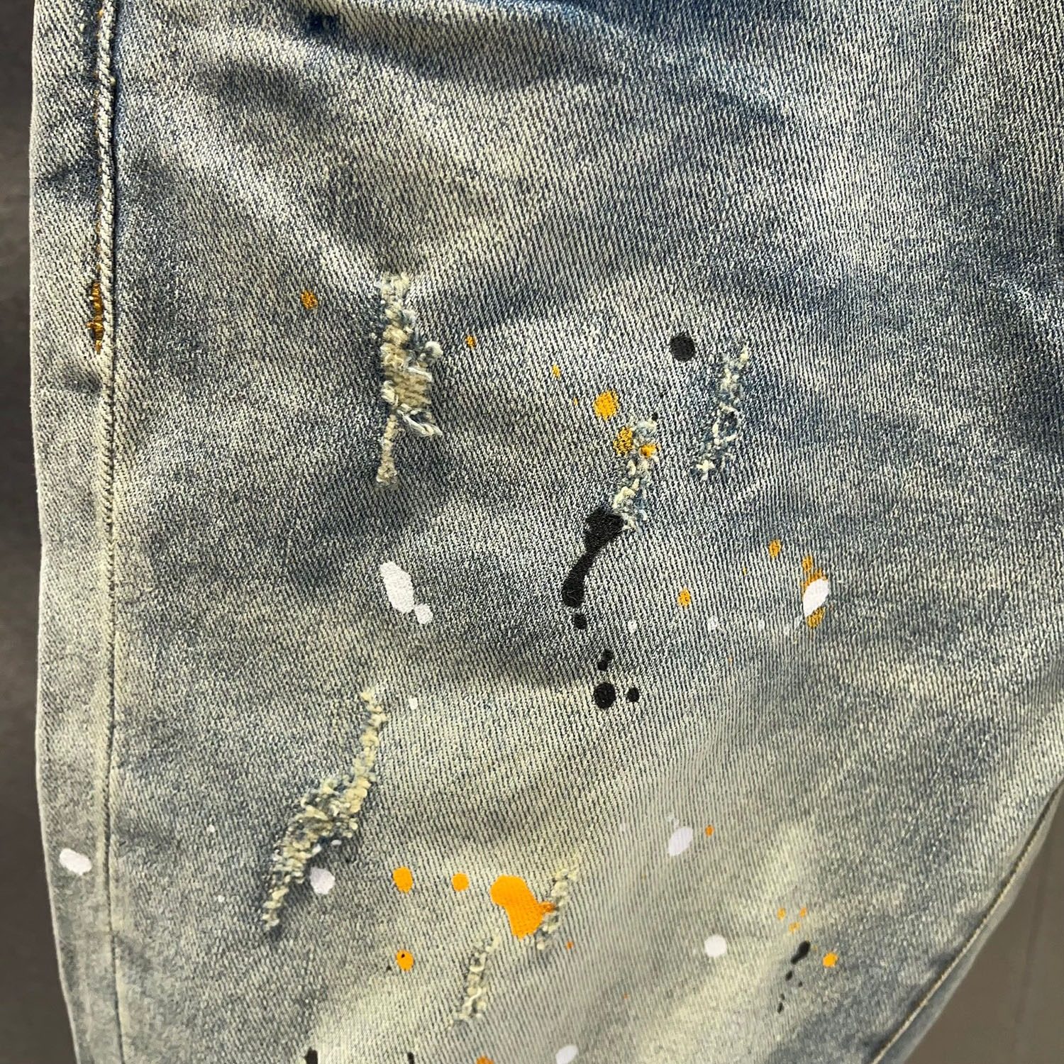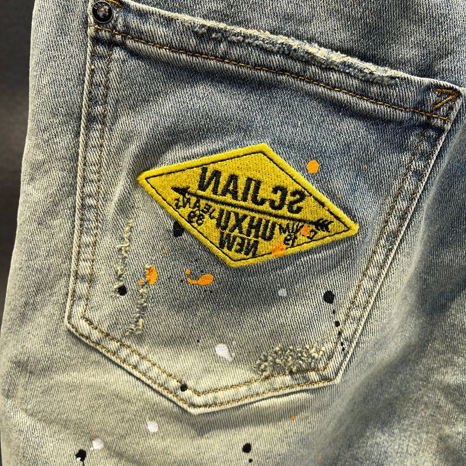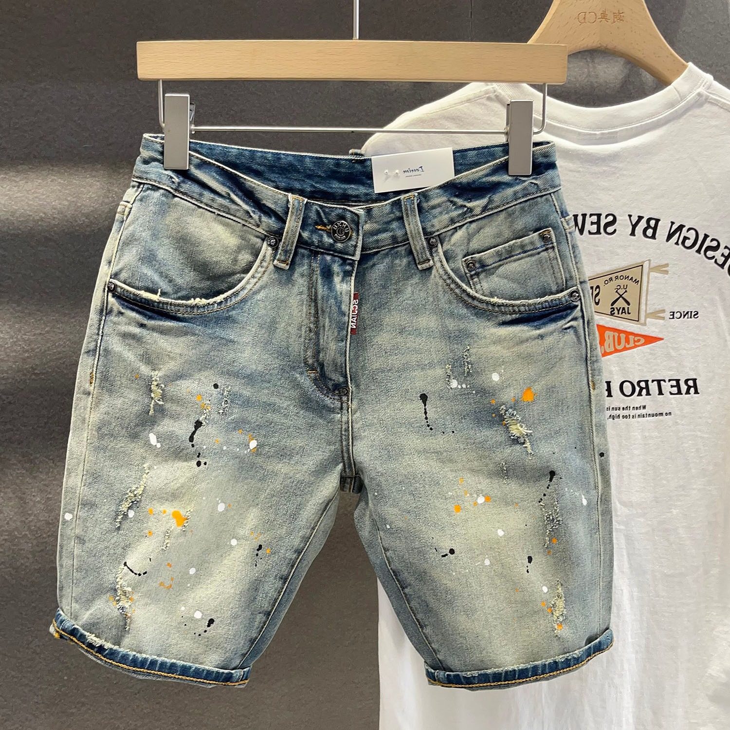 夏季泼墨牛仔短裤男款浅色破洞中裤高级设计感痞帅潮牌刺绣五分裤