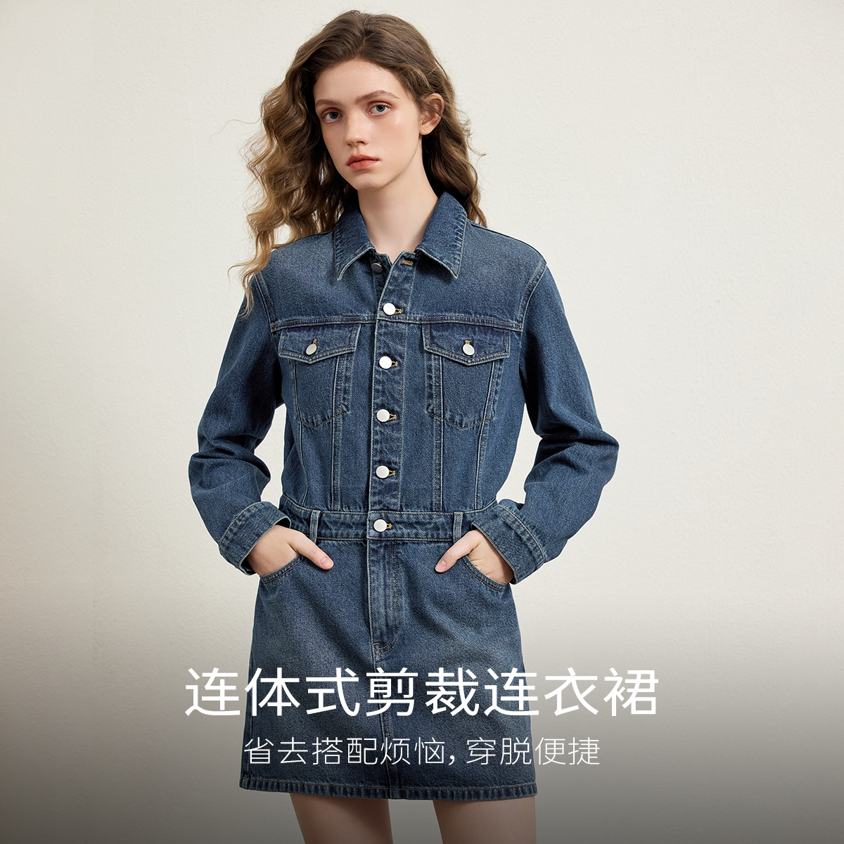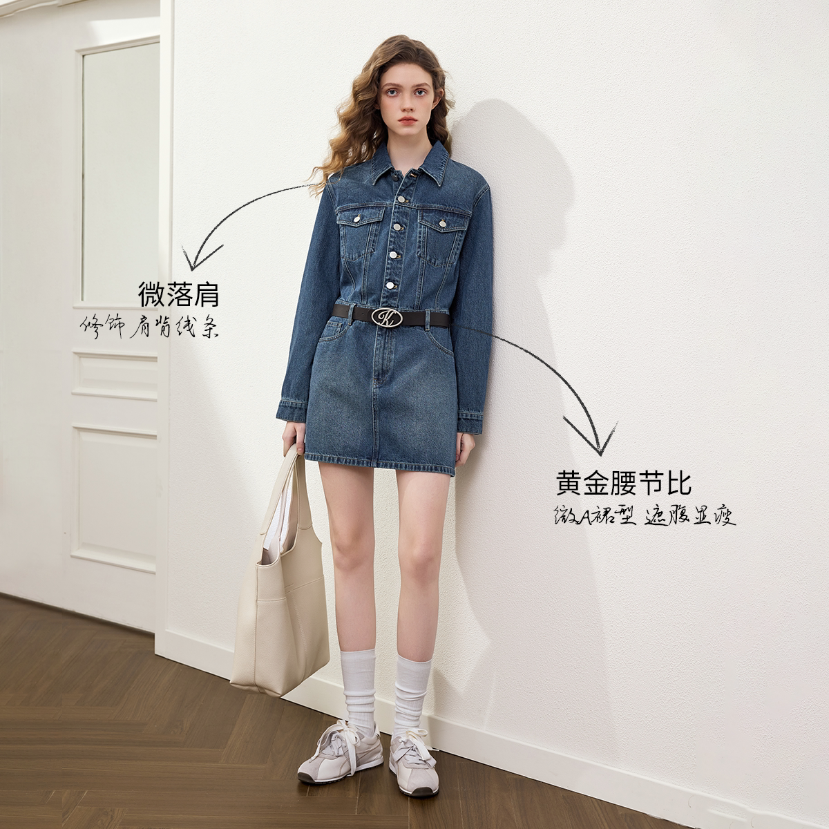 KBNE小个子纯棉翻领法式牛仔连衣裙女2026春季新款长袖收腰显瘦裙