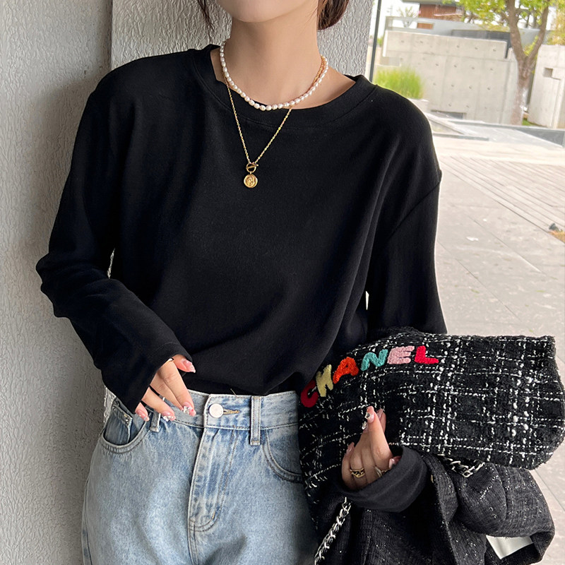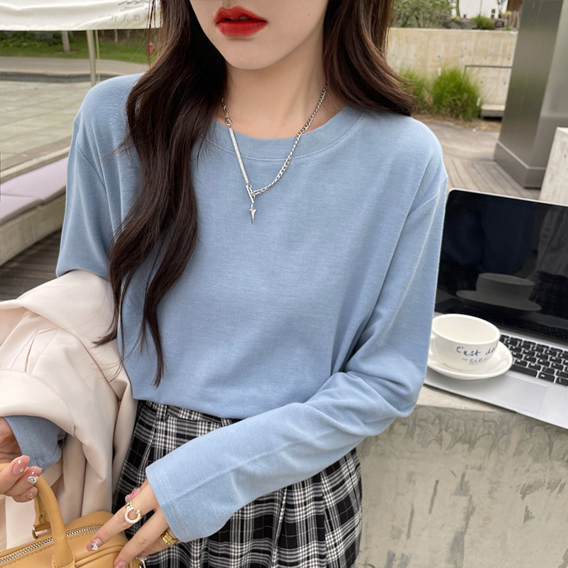 绿色长袖t恤女装休闲宽松春夏季内搭打底衫2026新款圆领白色上衣