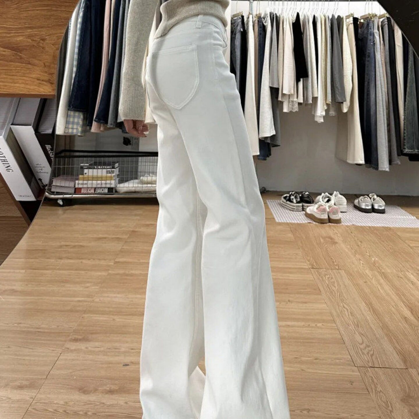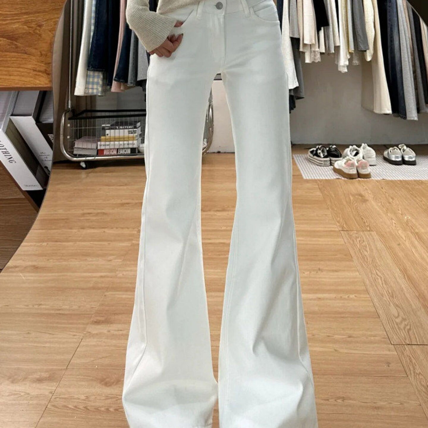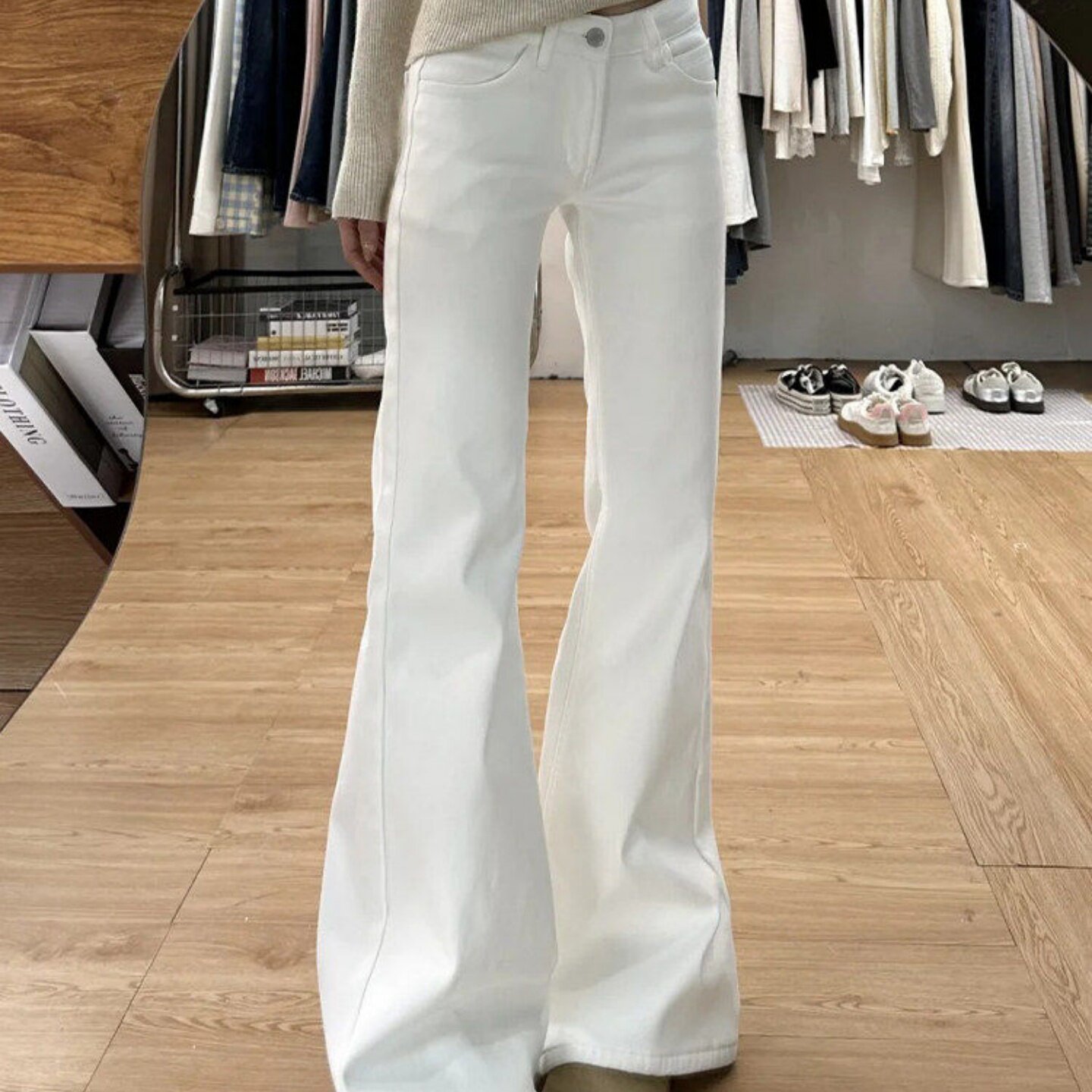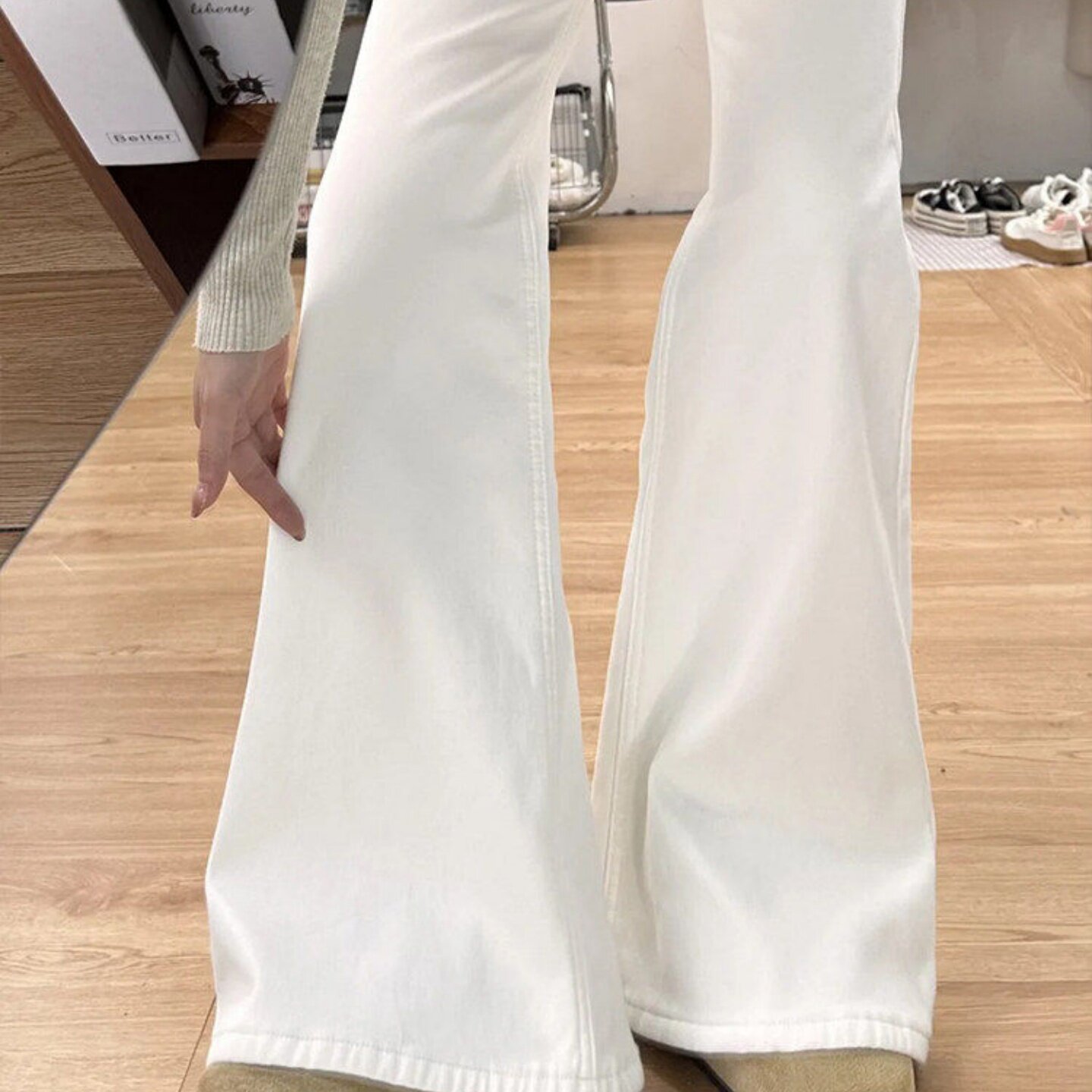 白色微喇加绒牛仔裤女2026新款中低腰显瘦宽松不贴腿直筒喇叭裤子
