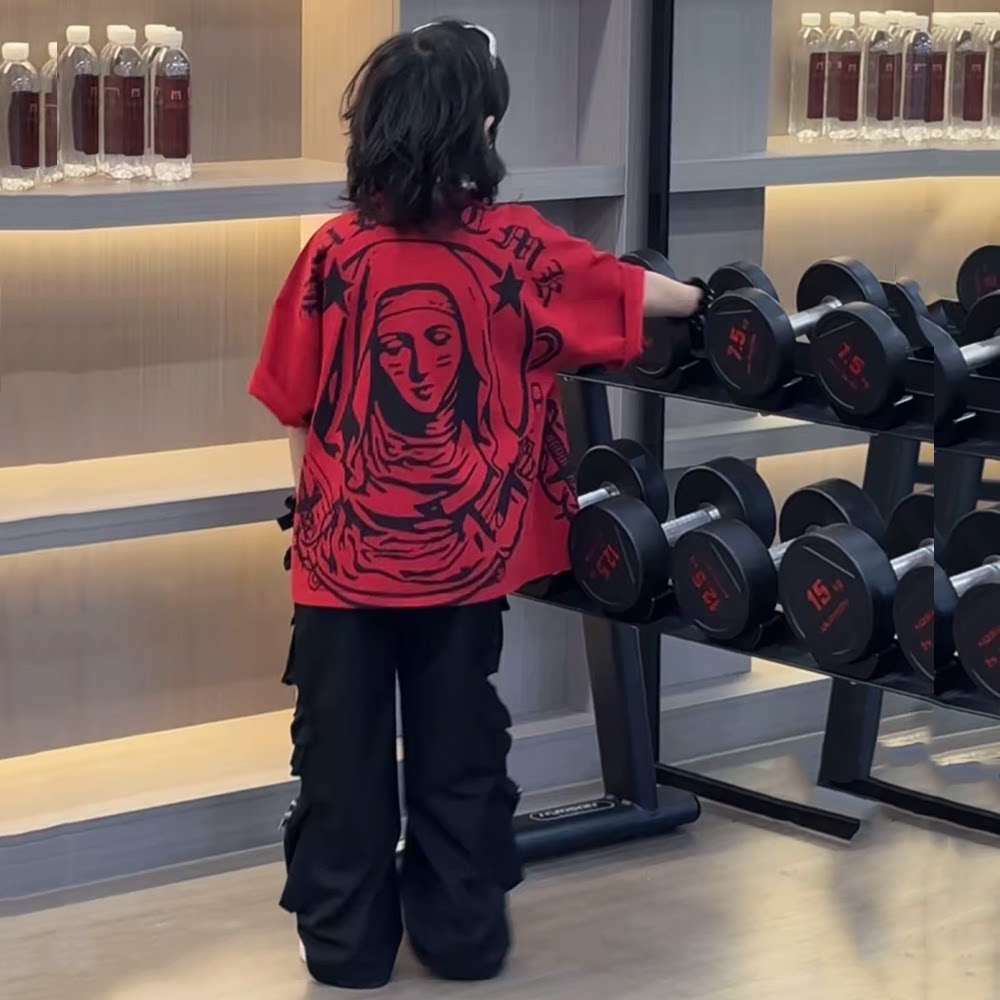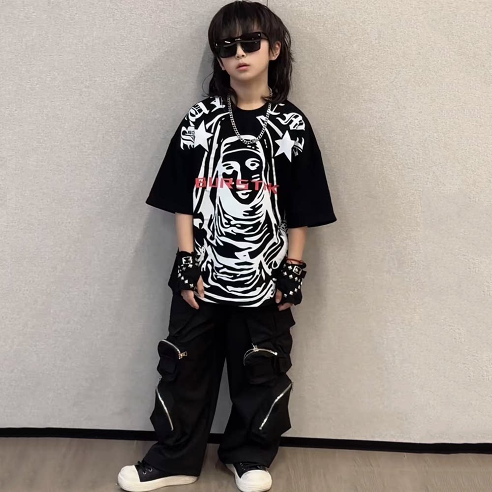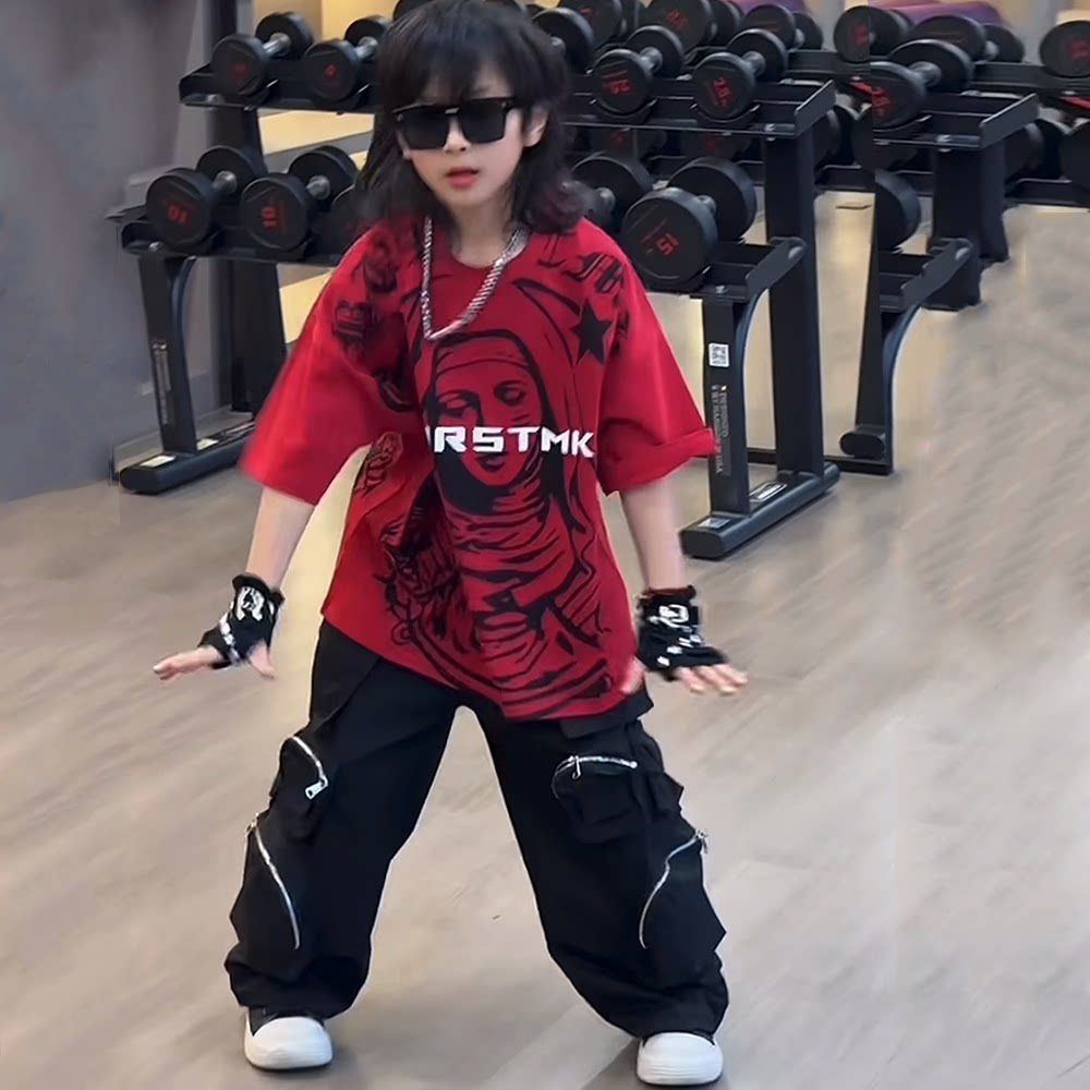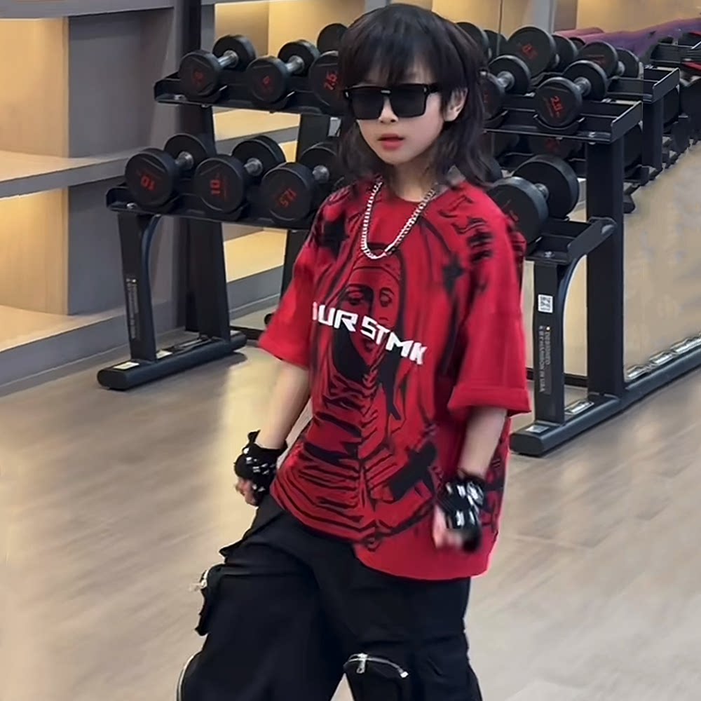男女童街舞春夏嘻哈上衣表演服青少年大童Hiphop短袖T恤潮酷夏装