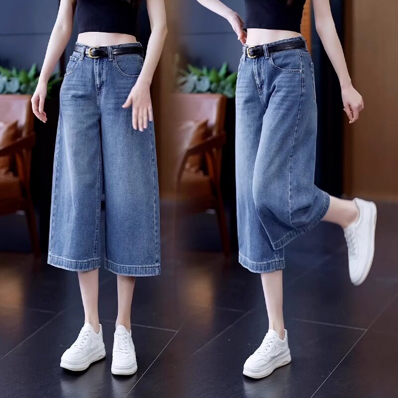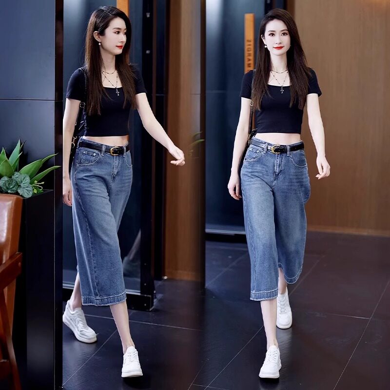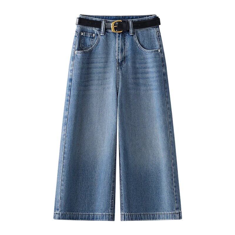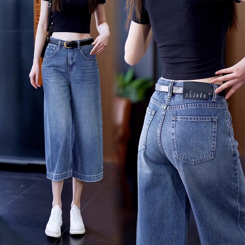 八分阔腿牛仔裤女夏季薄款2026新款高腰垂感宽松中裤蓝色直筒裤子