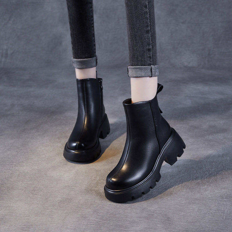 头层牛皮~高端~女鞋真皮粗跟厚底英伦马丁靴秋冬短靴百搭时尚休闲