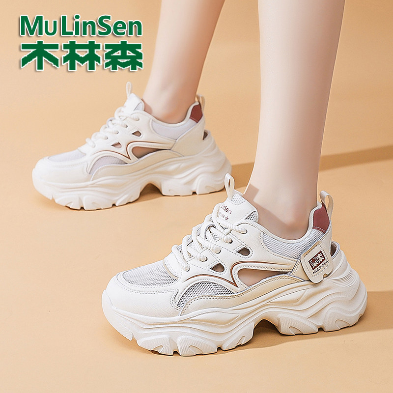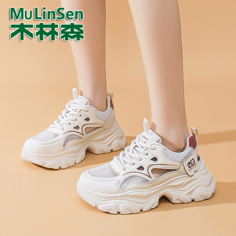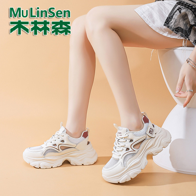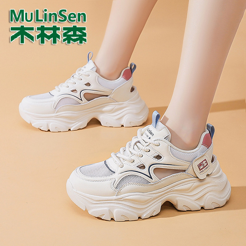 木林森真皮老爹鞋女2026新款夏季镂空网面透气女鞋厚底增高运动鞋