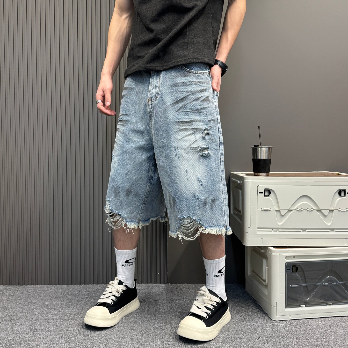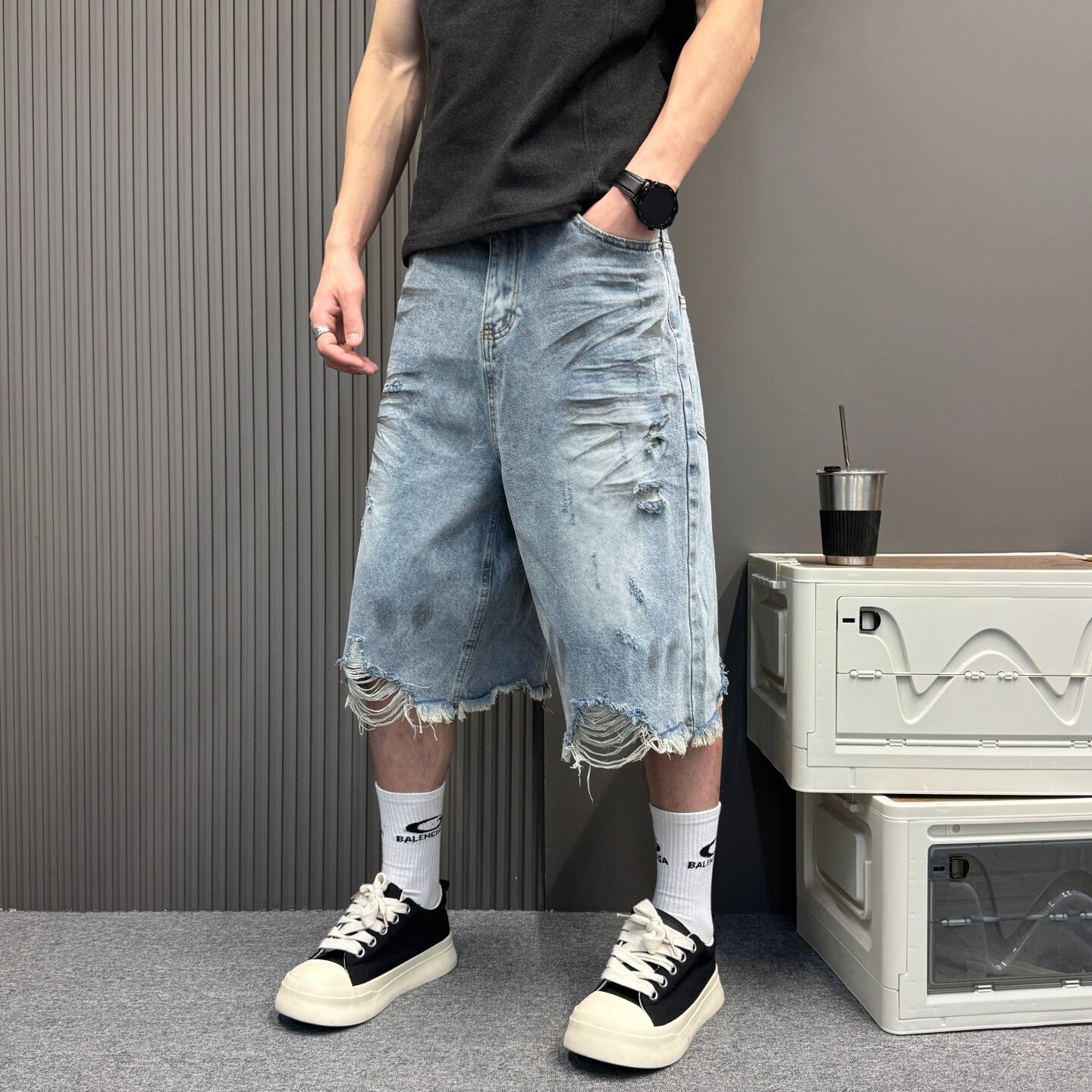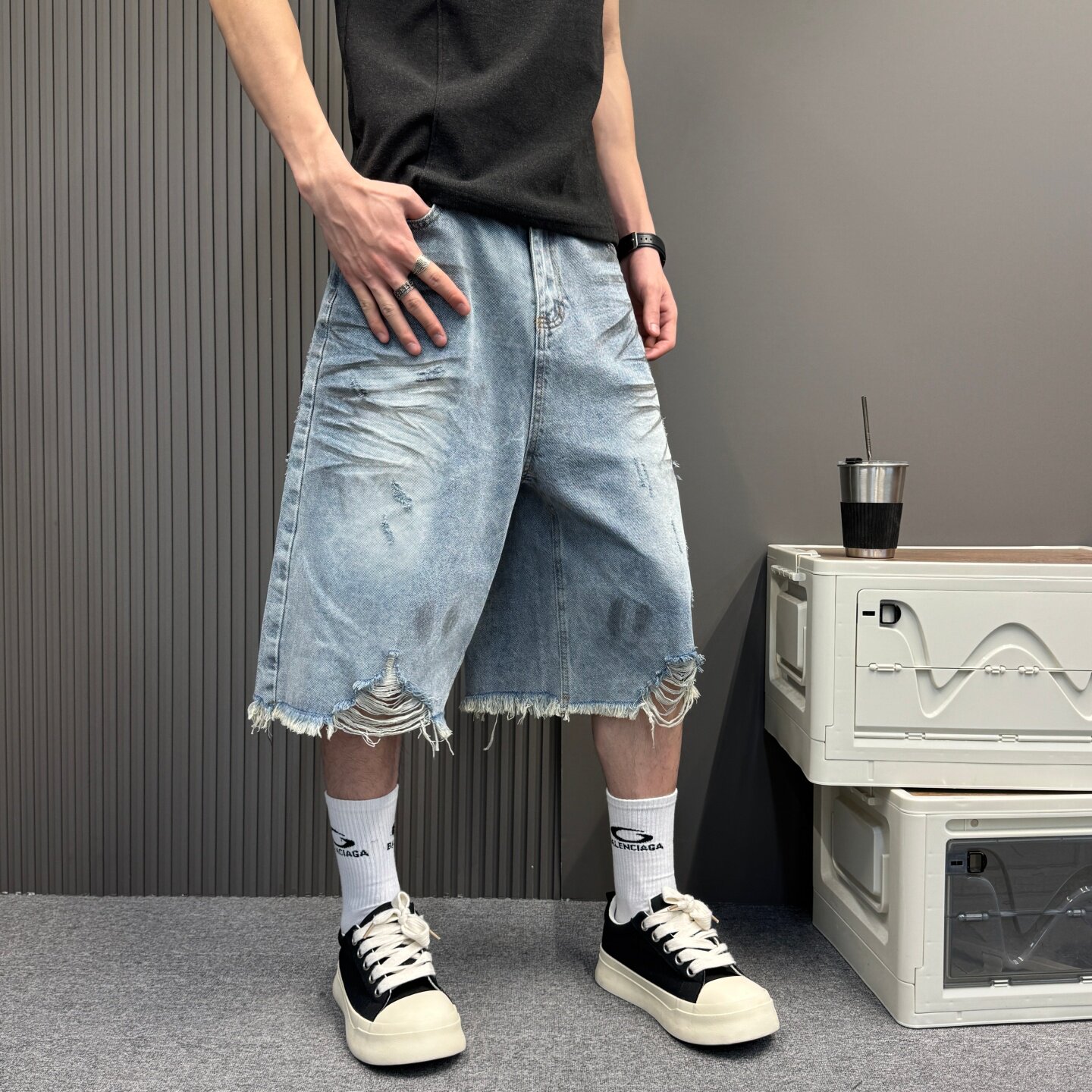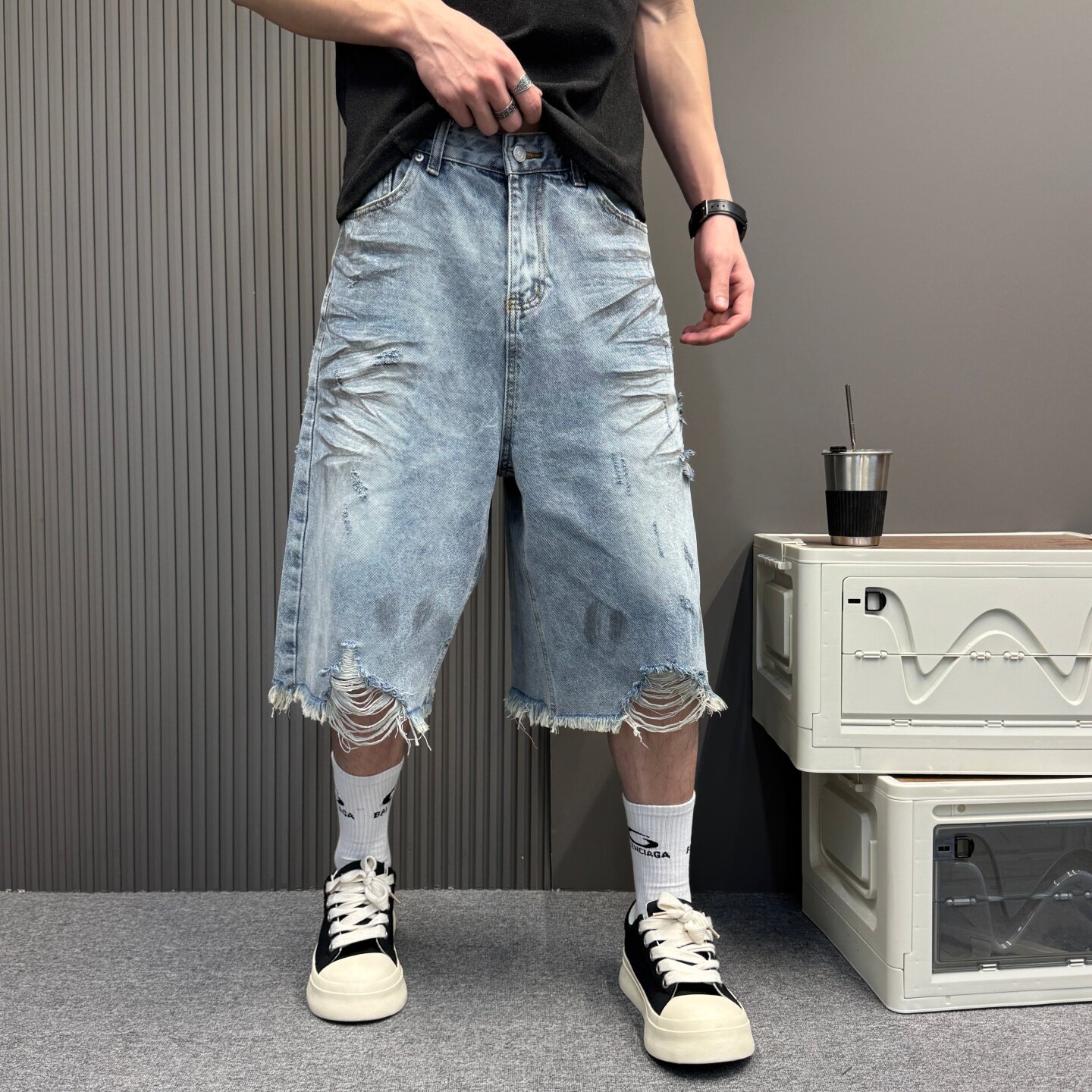 美式复古潮流裤子男款夏季休闲百搭通勤七分短裤宽松破洞街头牛仔