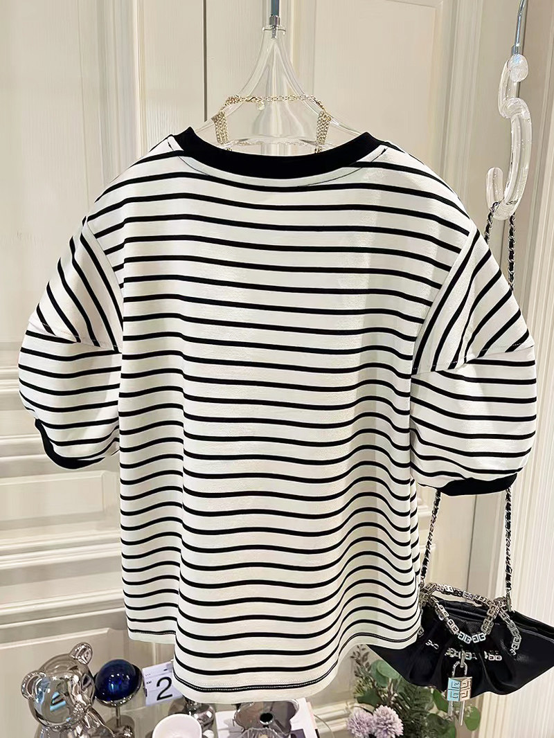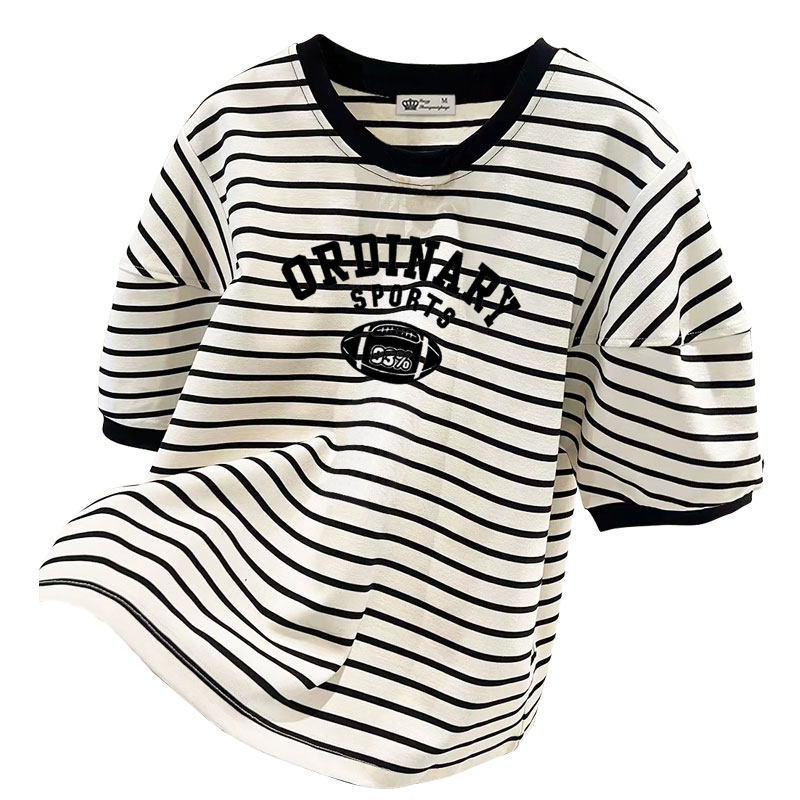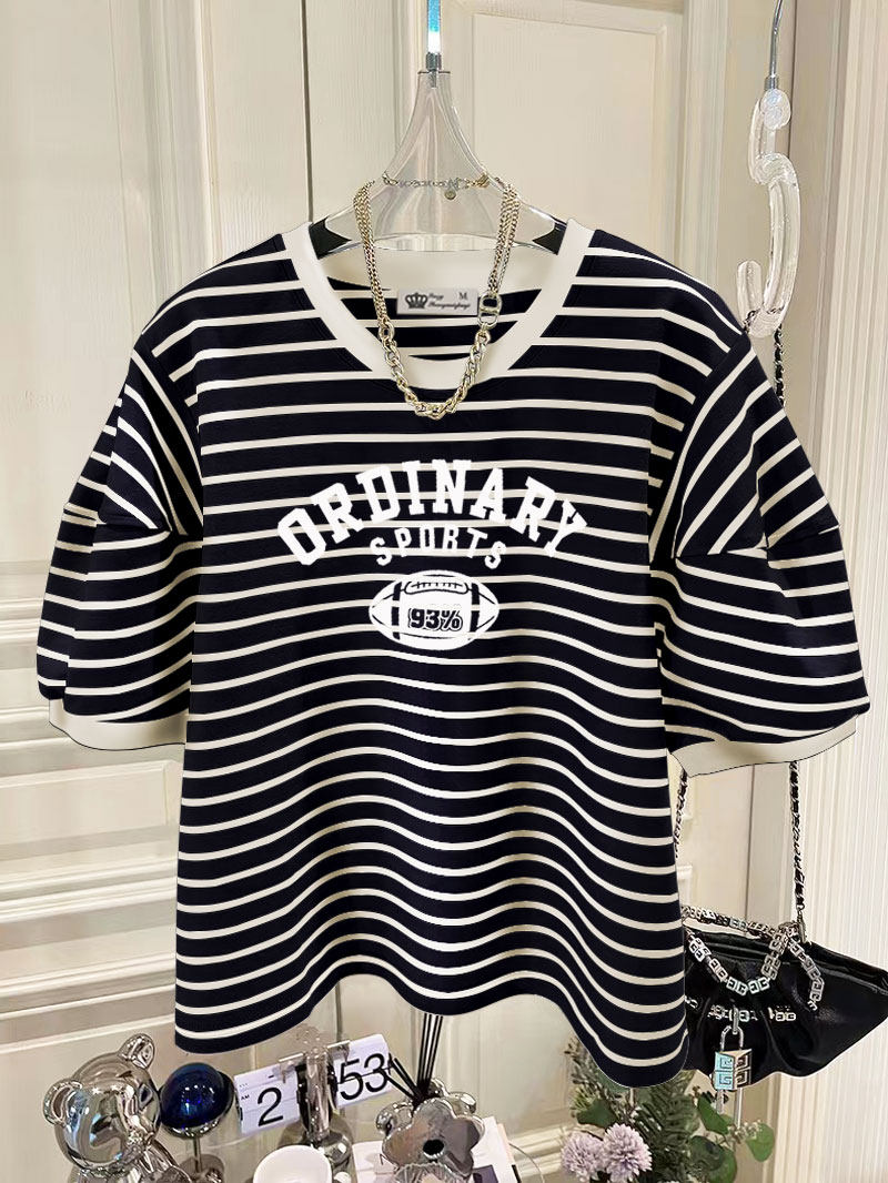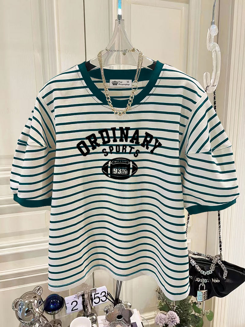 2026新款美式复古橄榄球印花小衫上衣法式小众条纹泡泡短袖T恤女