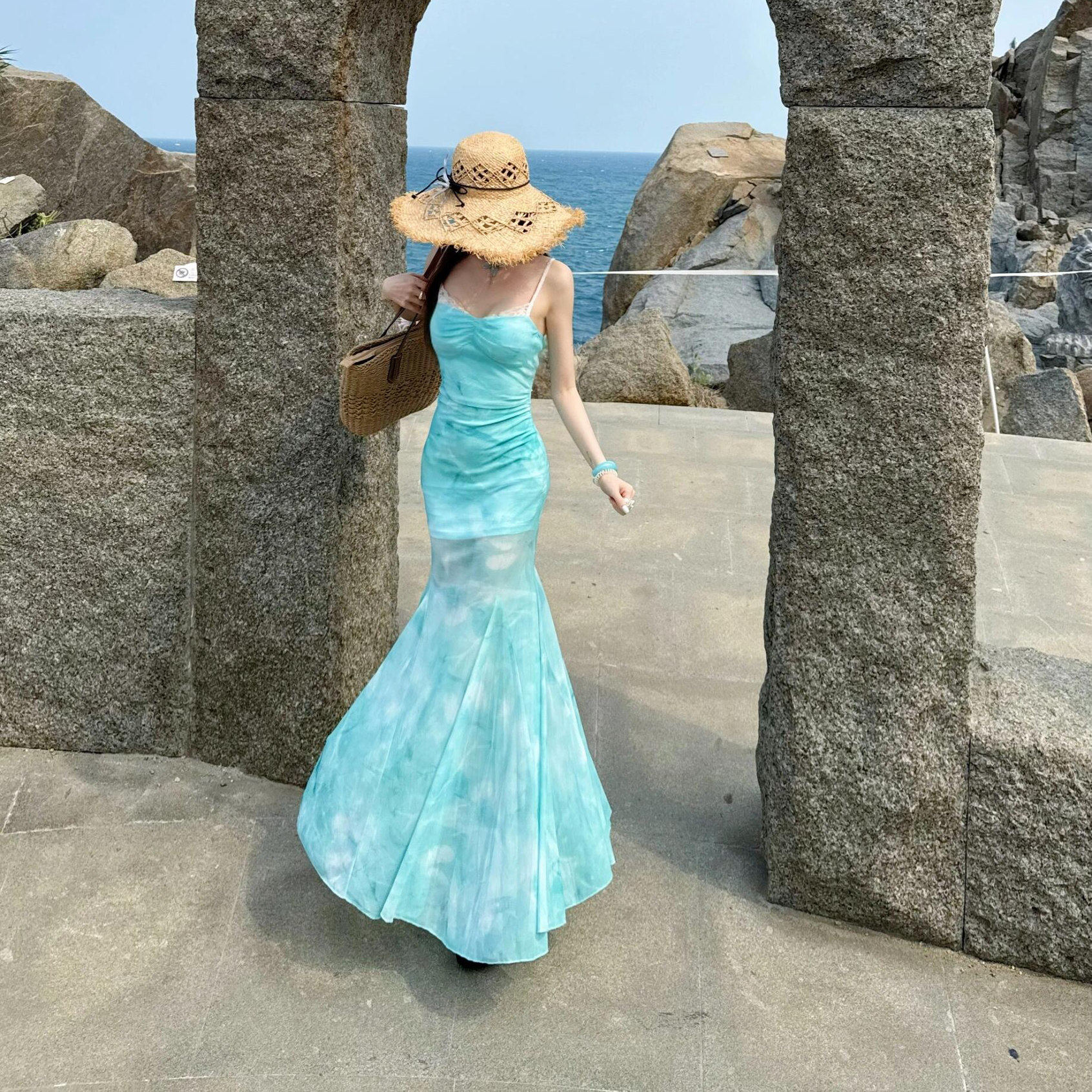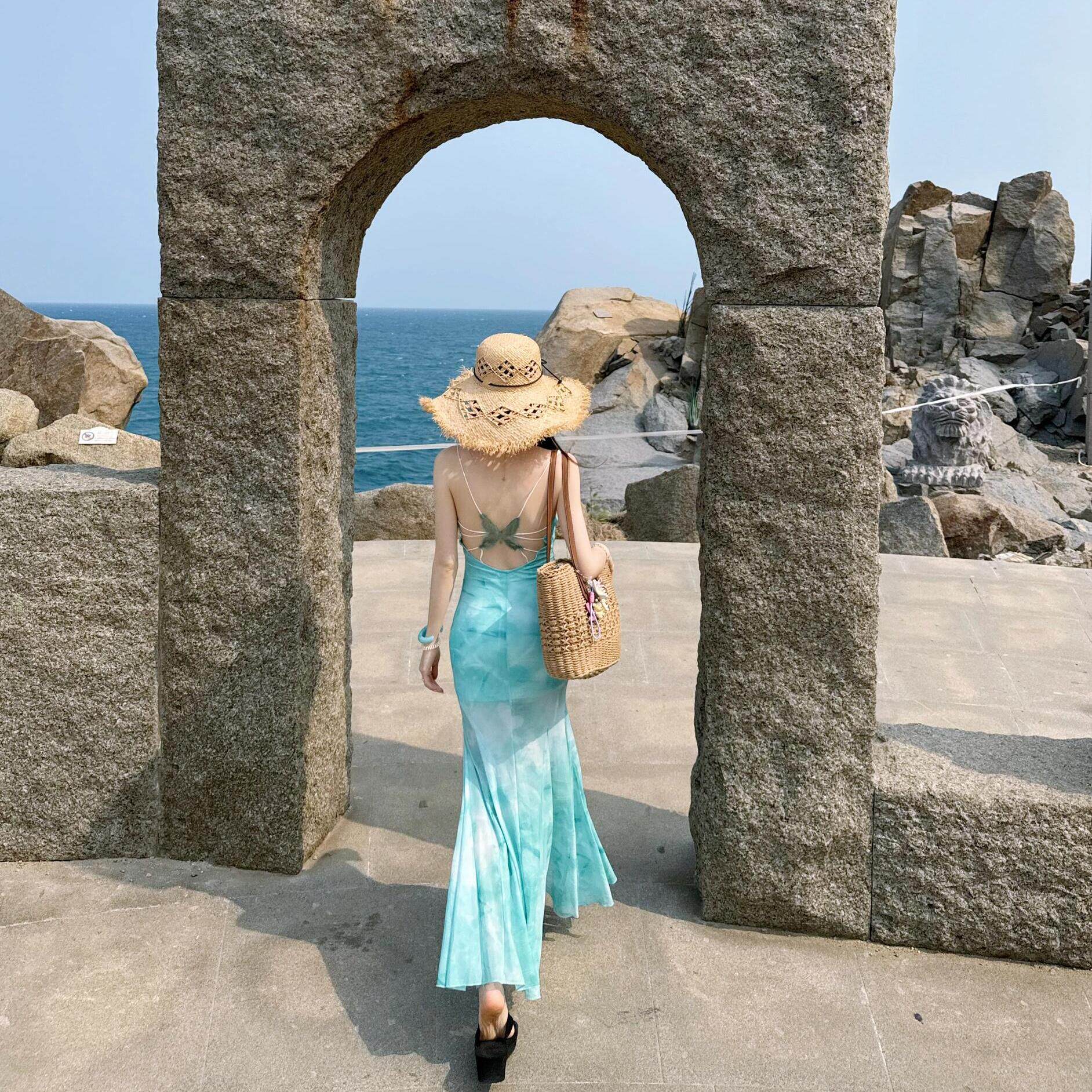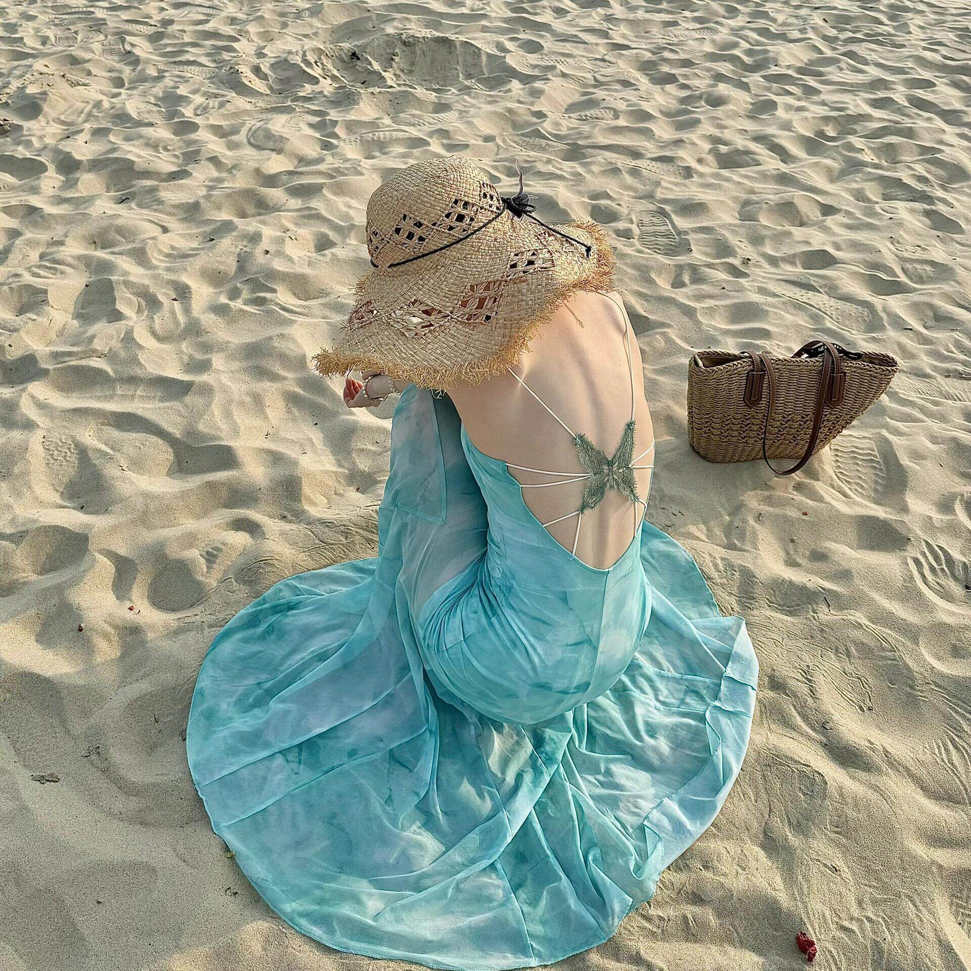 纯欲性感蝴蝶露背吊带连衣裙女夏季海边度假网纱修身包臀鱼尾长裙