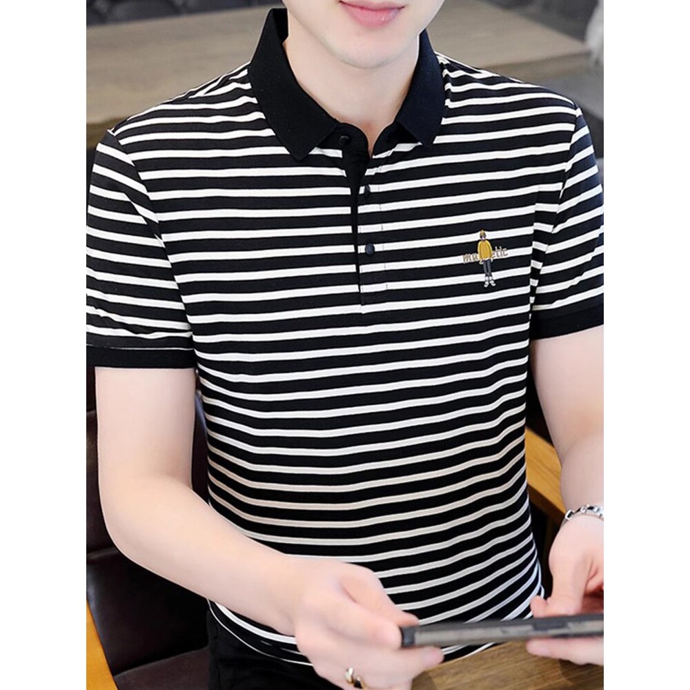 条纹衬衫男士短袖polo衫纯棉修身冰丝t恤夏季潮牌ins长袖衬衣潮流