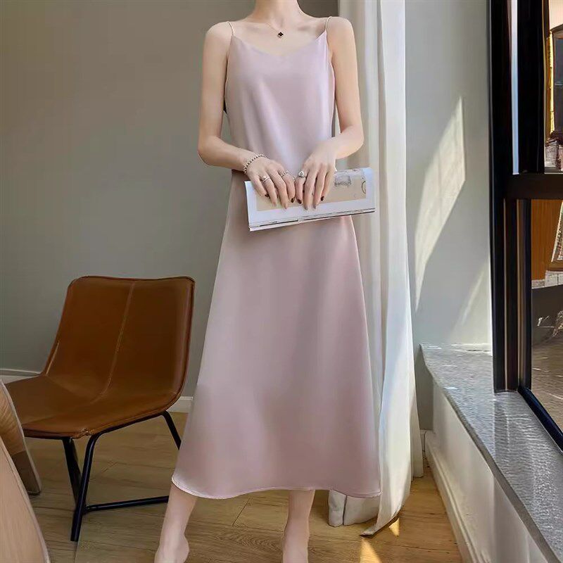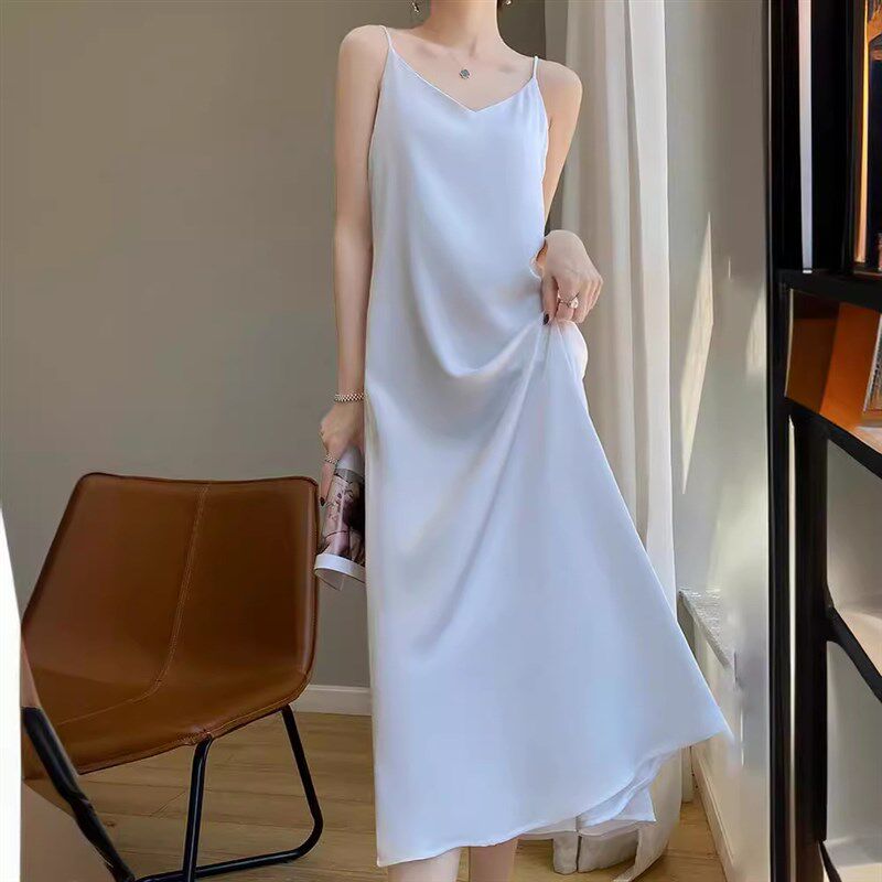 2024新款吊带裙女夏季气质醋酸V领缎面礼服连衣裙内搭修身 长裙潮