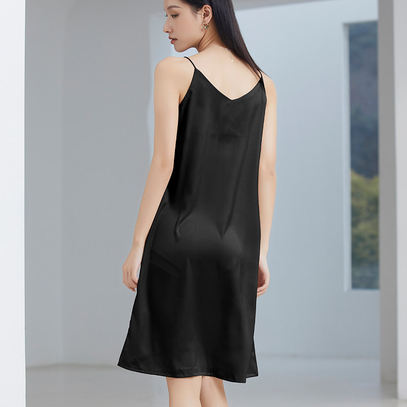 吊带连衣裙女仿真丝醋酸缎面夏季法式冰丝带胸垫黑色修身气质长裙
