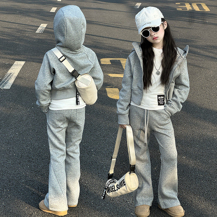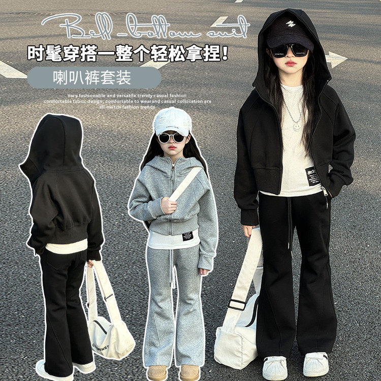 2026长袖薄款女童春季连帽外套喇叭裤休闲运动风2件套装洋气百搭
