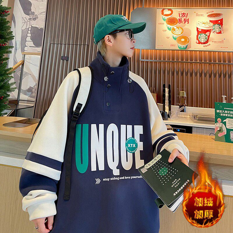 冬款青少年双面奥粒绒卫衣男生帅气印花加绒加厚长袖T恤大童外套
