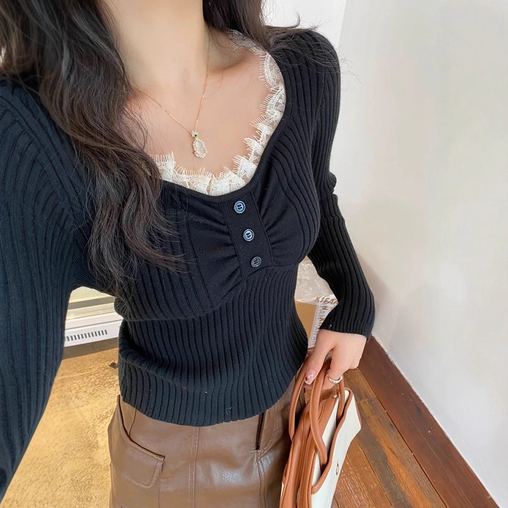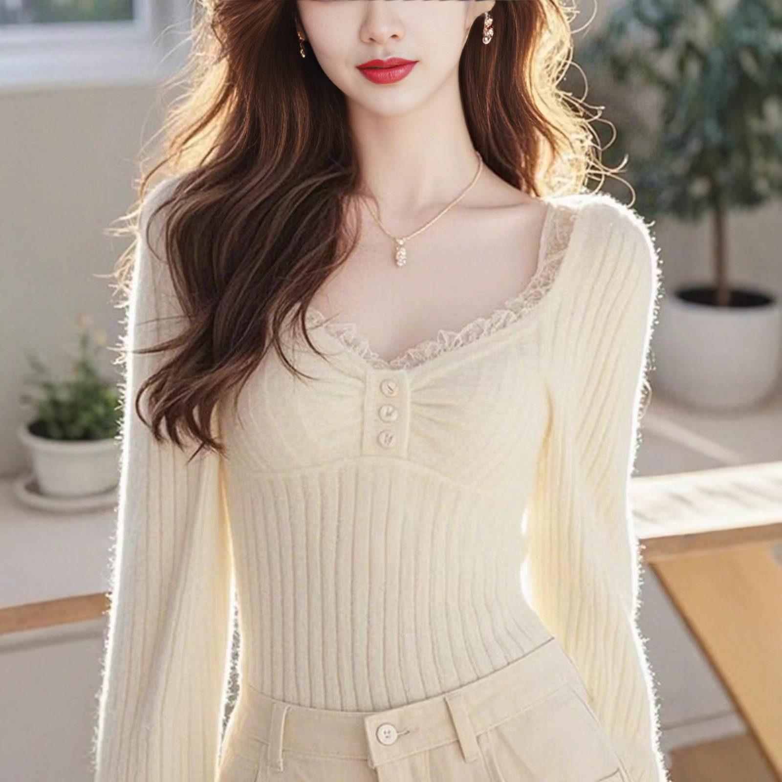 v领蕾丝针织打底衫女款内搭修身2026春季新款感毛衣短款上衣