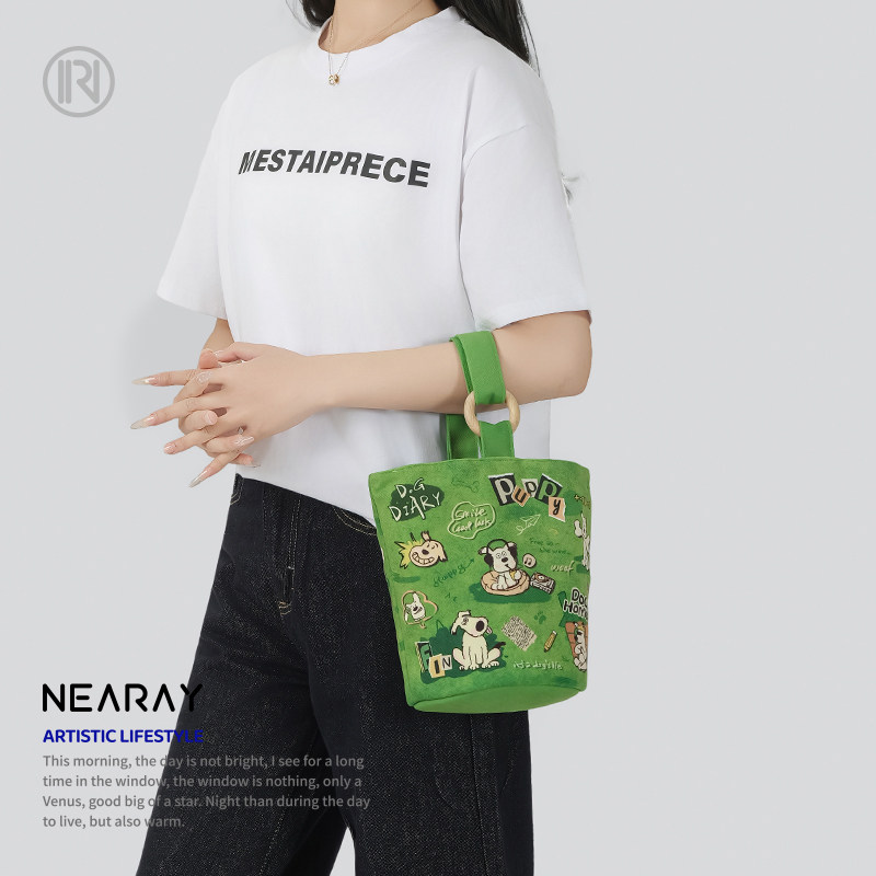 311线报网描述:小狗印花可爱俏皮 绿色简约清新水桶包