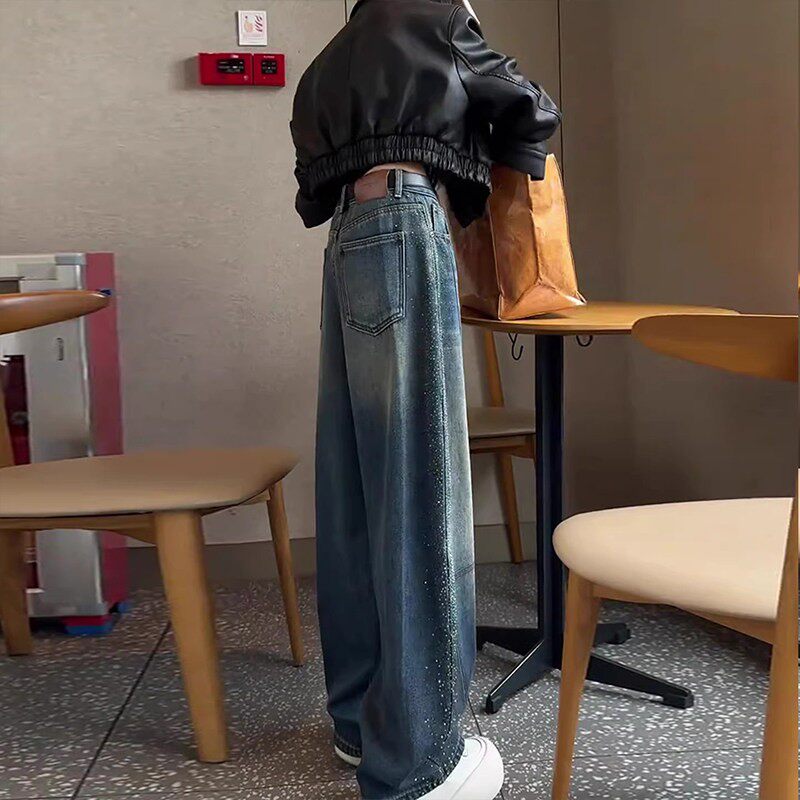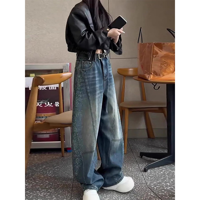 满天星烫钻弯刀牛仔裤女加绒春季2026年新款设计感宽松垂感阔腿裤