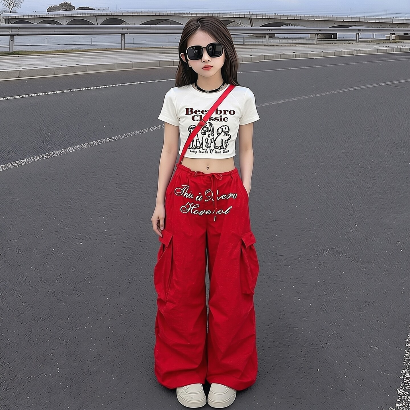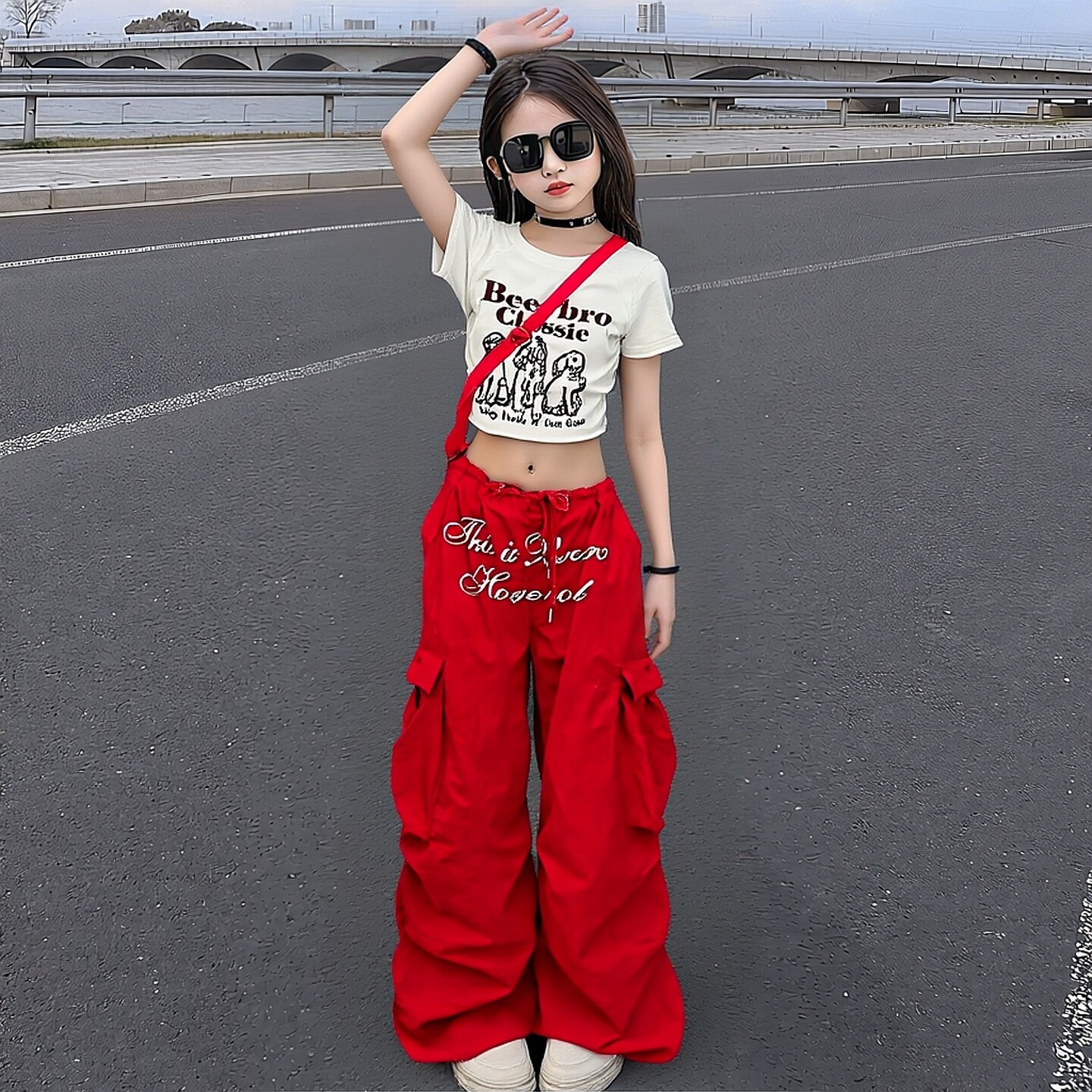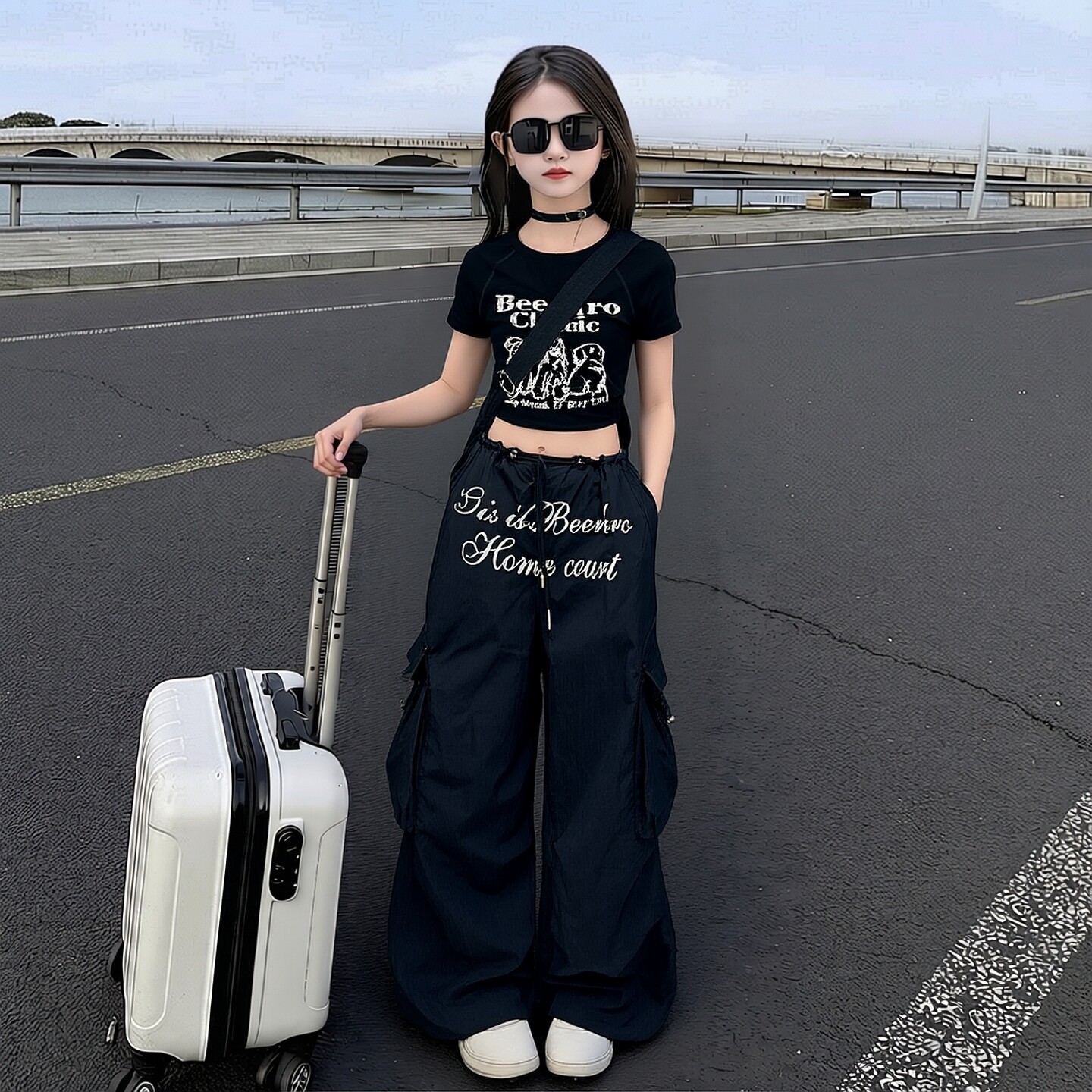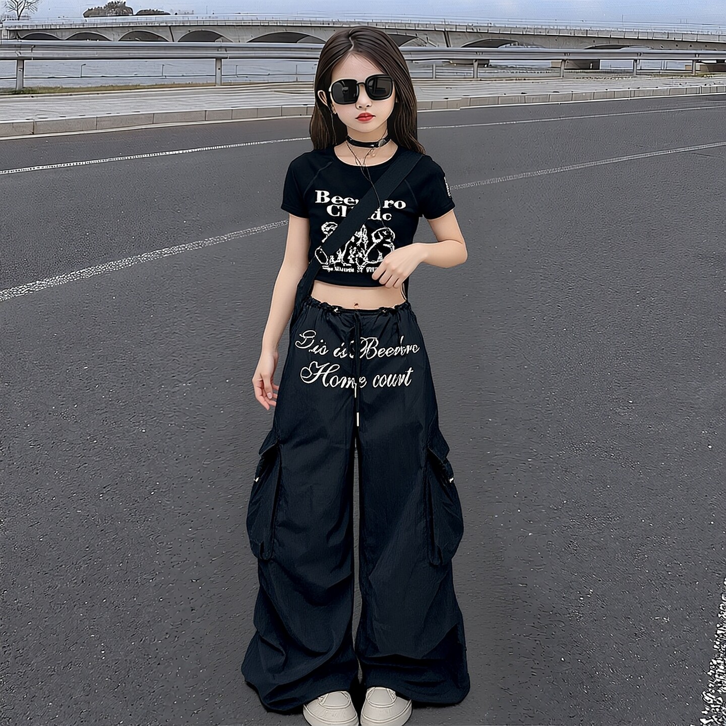 女童卡通短袖T恤2026春夏新款中大童潮搭爵士街舞速干工装裤套装