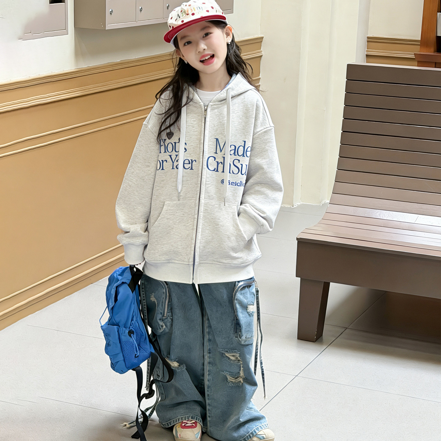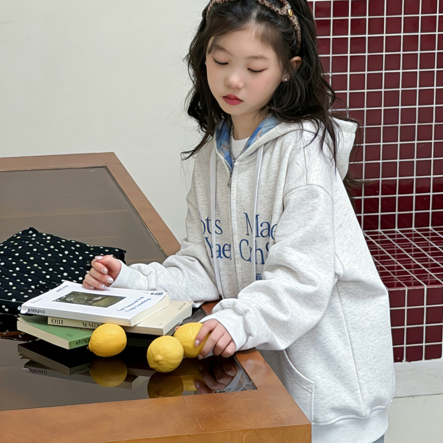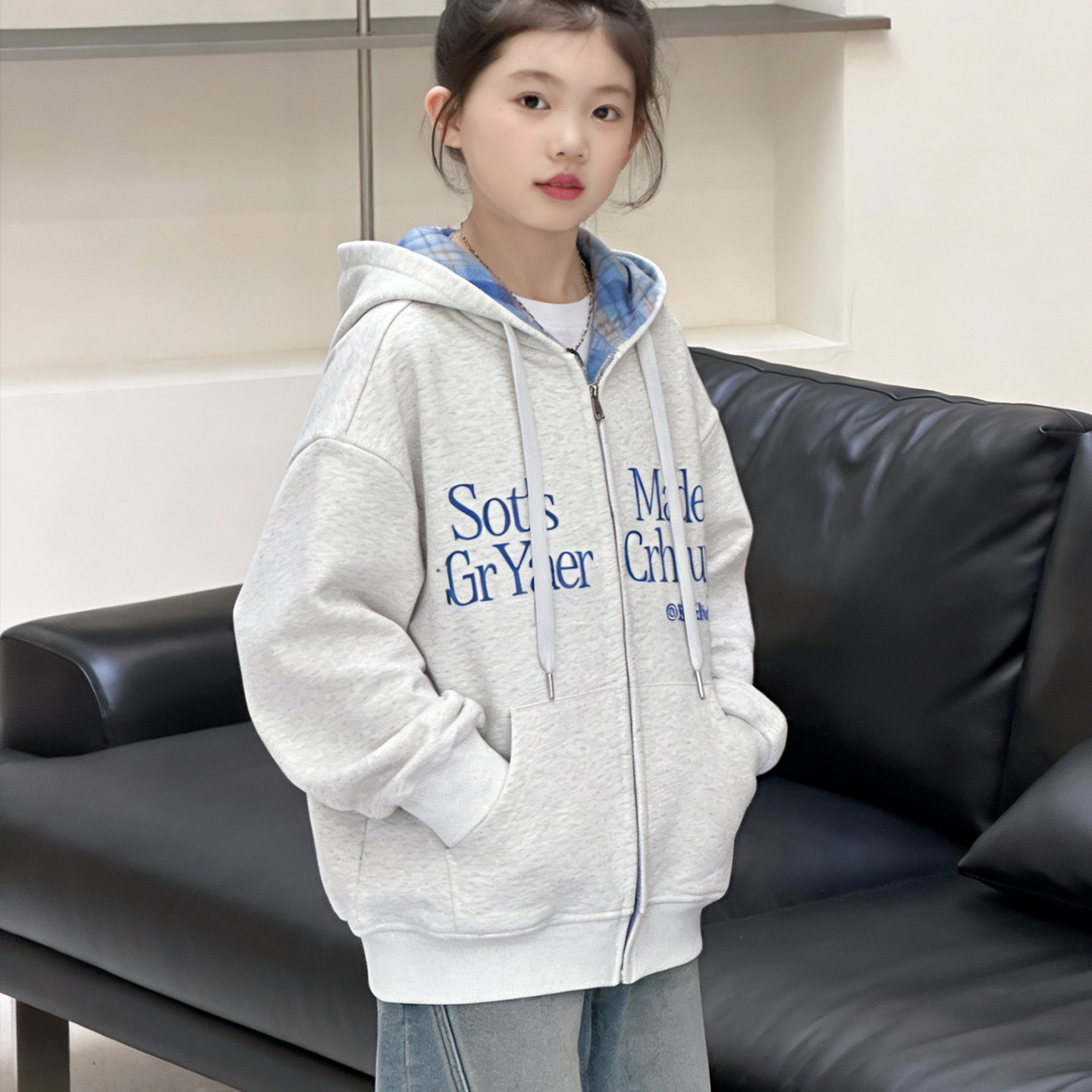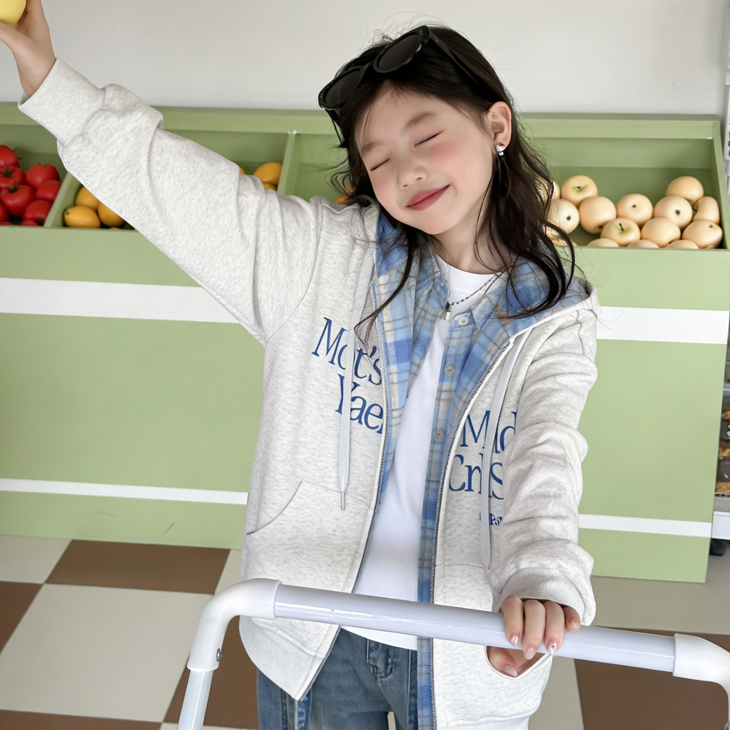 女童连帽外套2026春装新款儿童韩系格子拼接卫衣大童春秋刺绣上衣