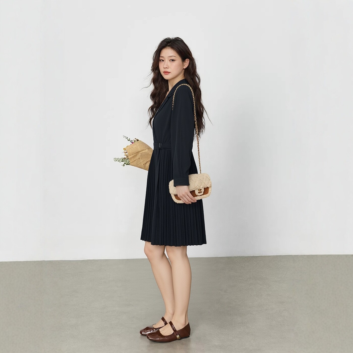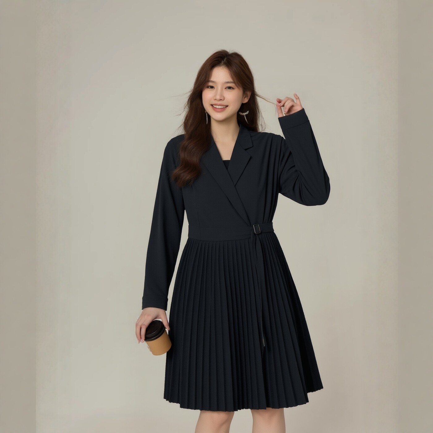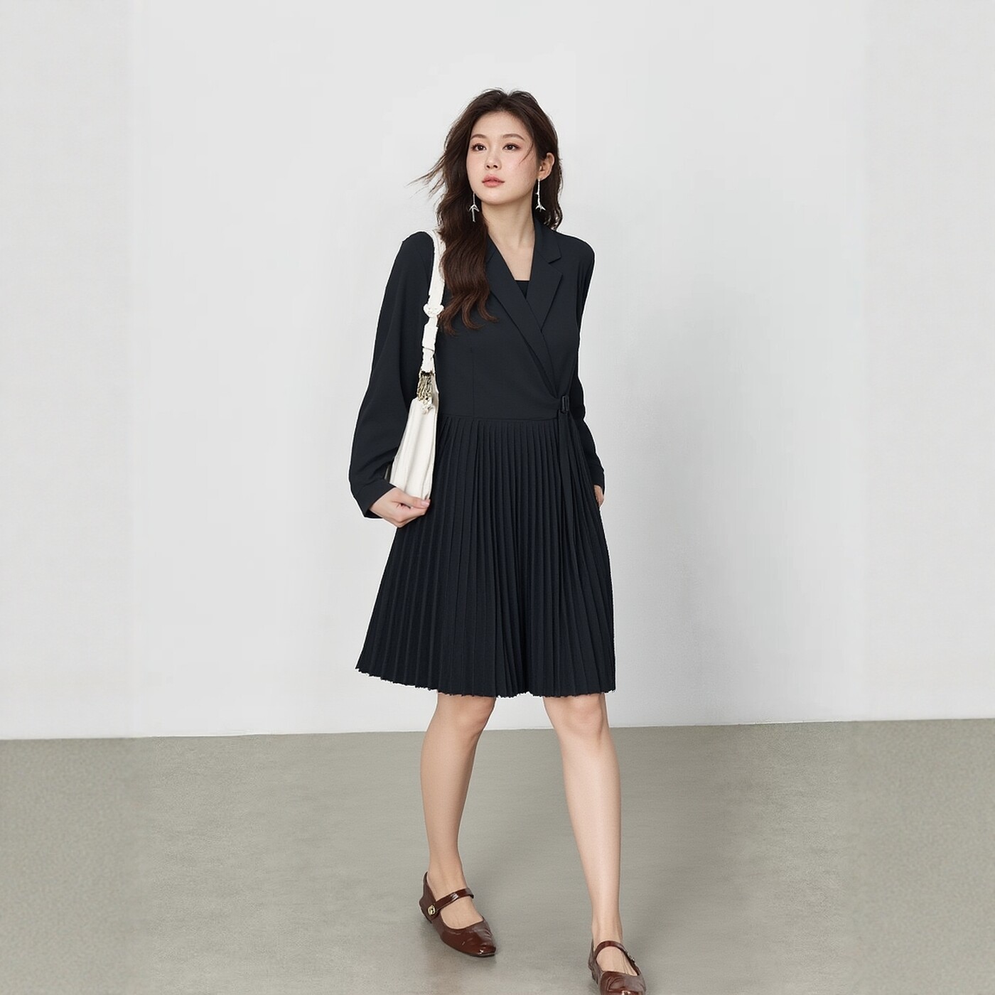 连衣裙女大码胖mm梨型身材正肩长袖百褶西装裙设计感可解开当外套