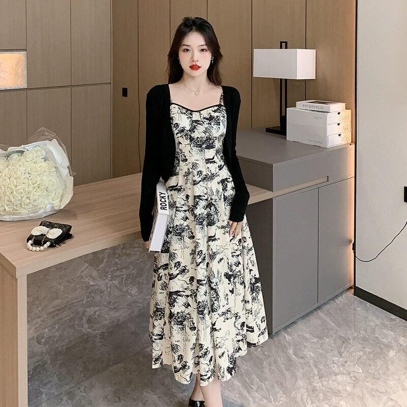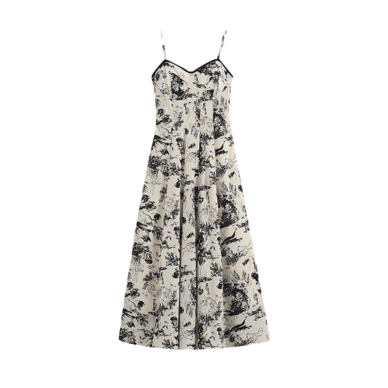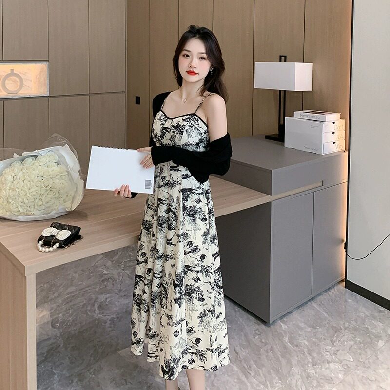 99212-048吊带连衣裙女大码胖mm遮肚子显瘦水墨画裙子梨型身材夏