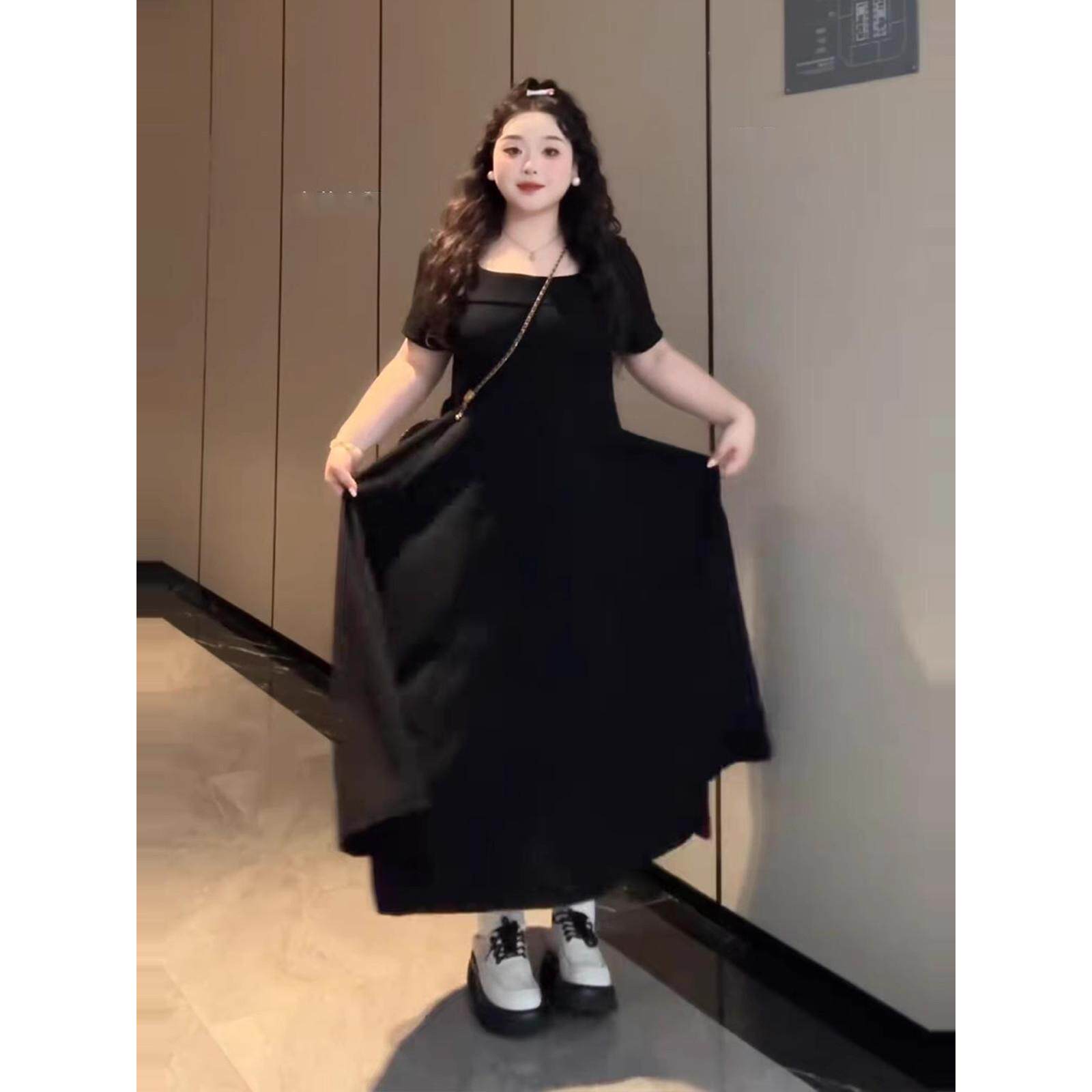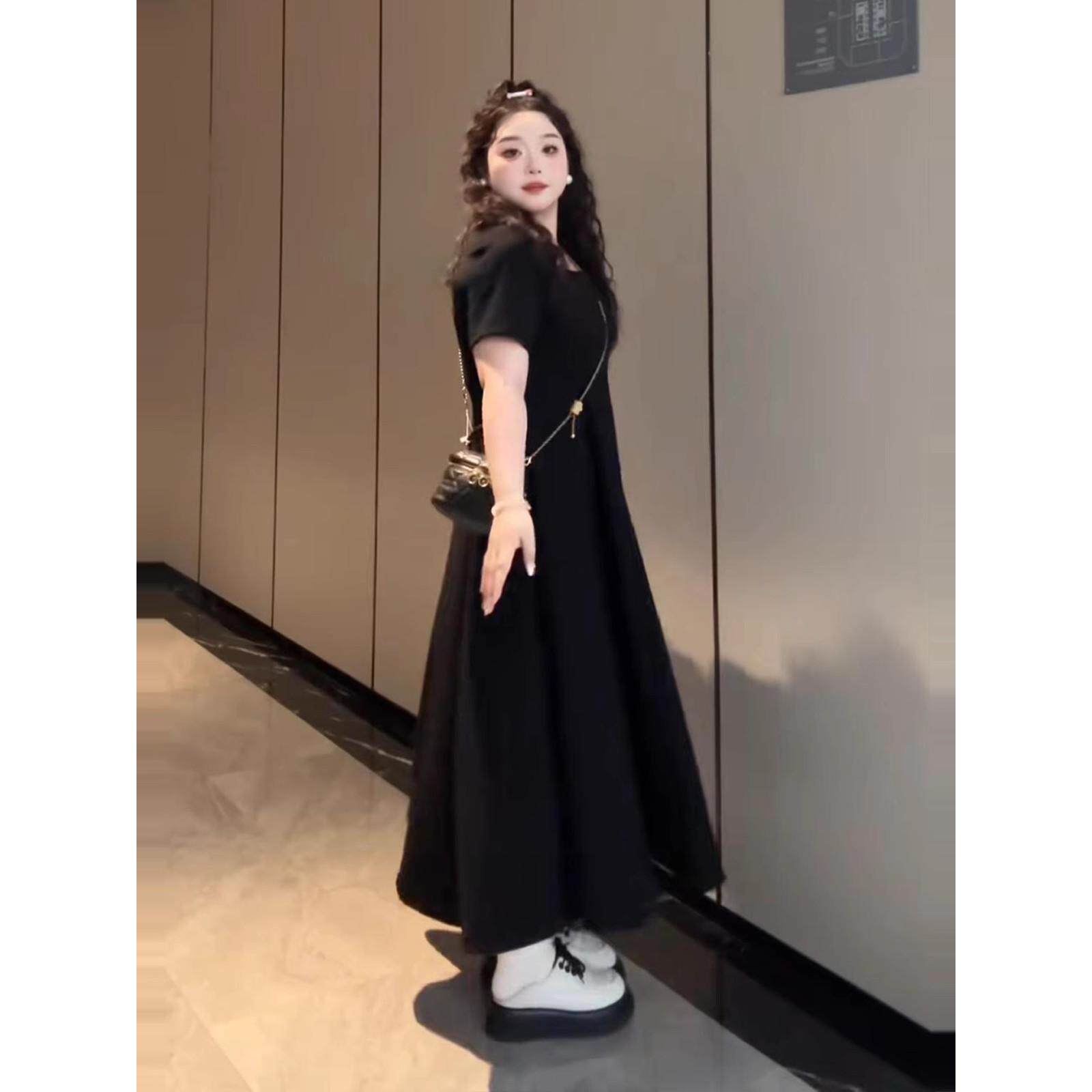 大码法式赫本风方领连衣裙女夏季胖mm梨型身材显瘦a字大摆长裙子