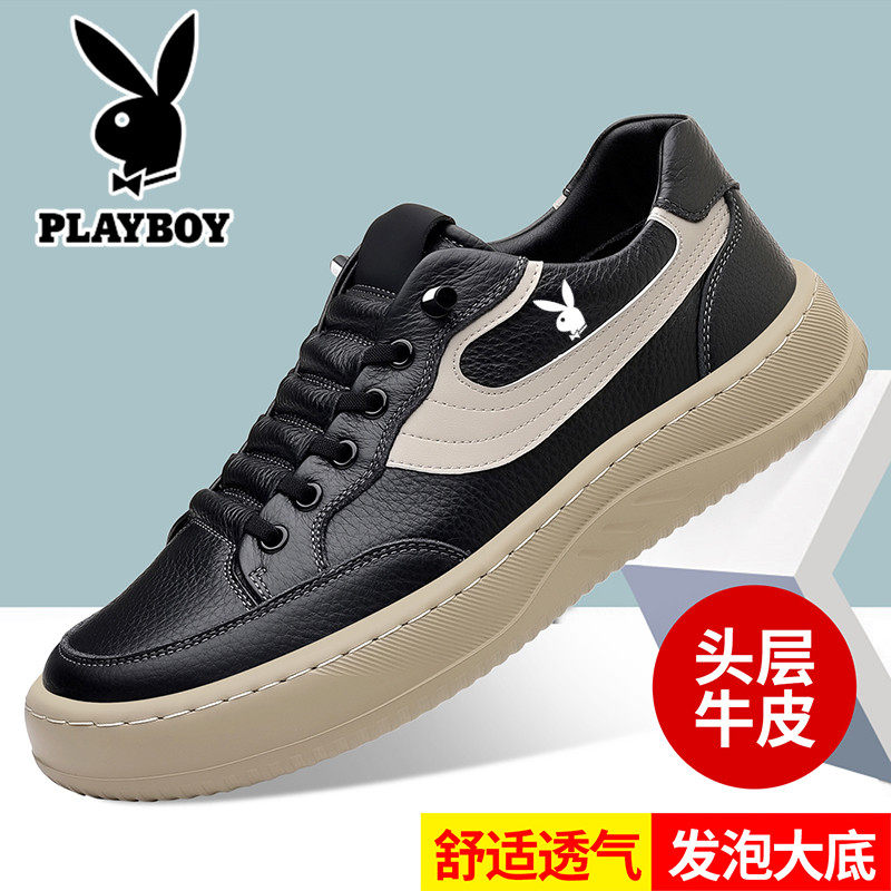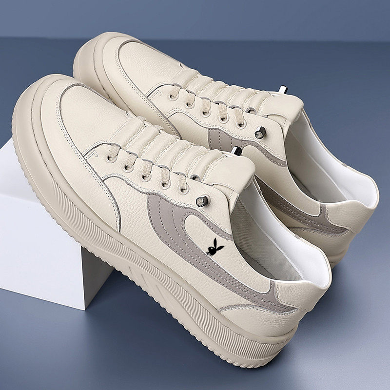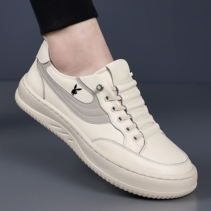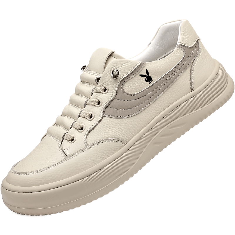 花花公子男鞋2026夏季新款透气真皮一脚蹬男士休闲鞋内增高小白鞋